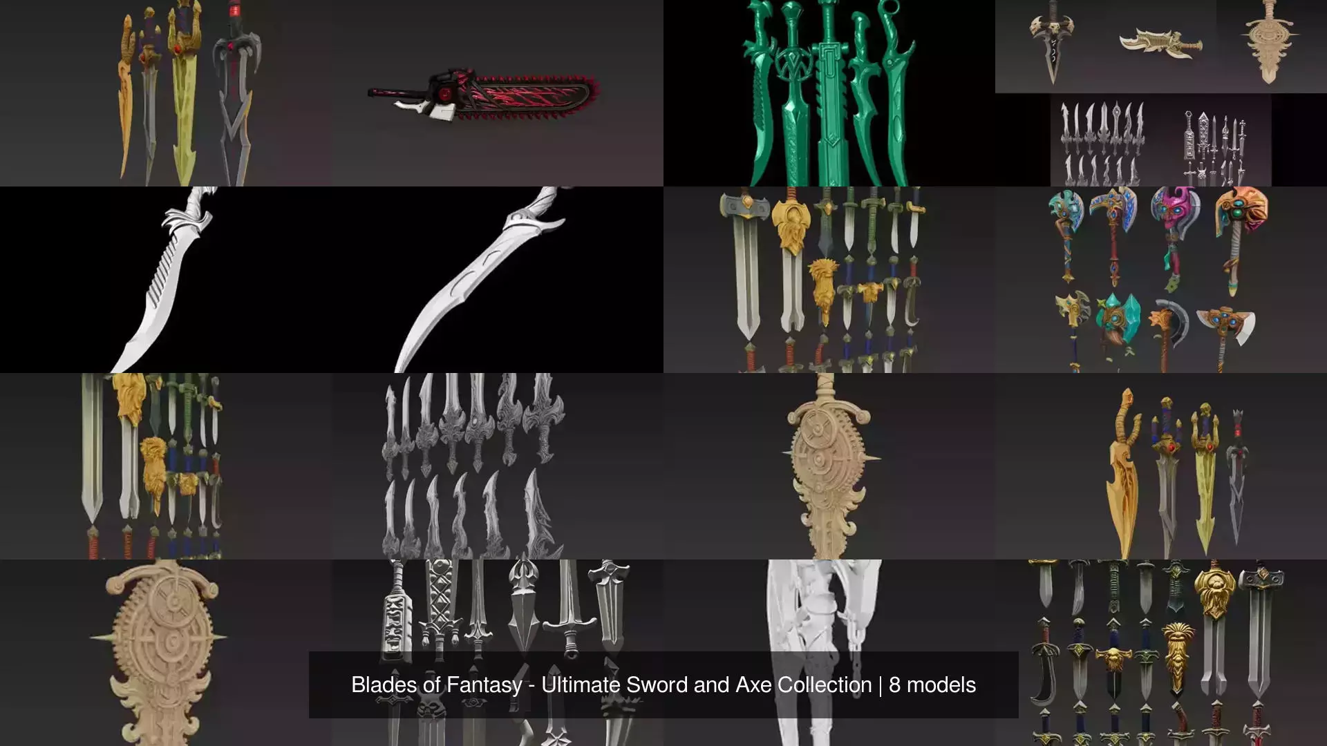 This collection comes in high-resolution format (500K+ polygons) for exceptional surface detail.Each sword and axe model is ideal for fantasy rendering, collectible 3D prints, or digital scene design.Polygon reduction is recommended for game-ready optimization.Scaling required for print.