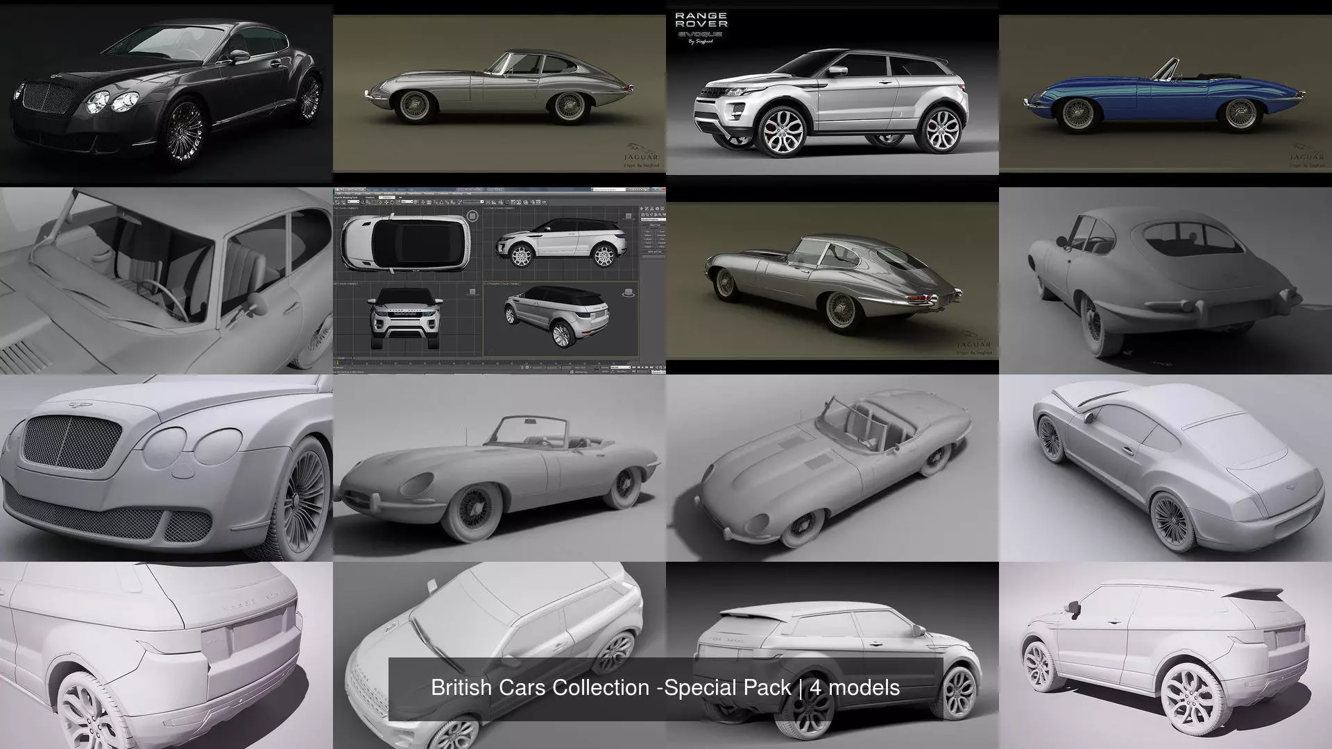 Specoial Pack of various British Cars : Jaguar Etype, Jaguar Etype Convertible, Bentley Continental GT, Range Rover Evoque