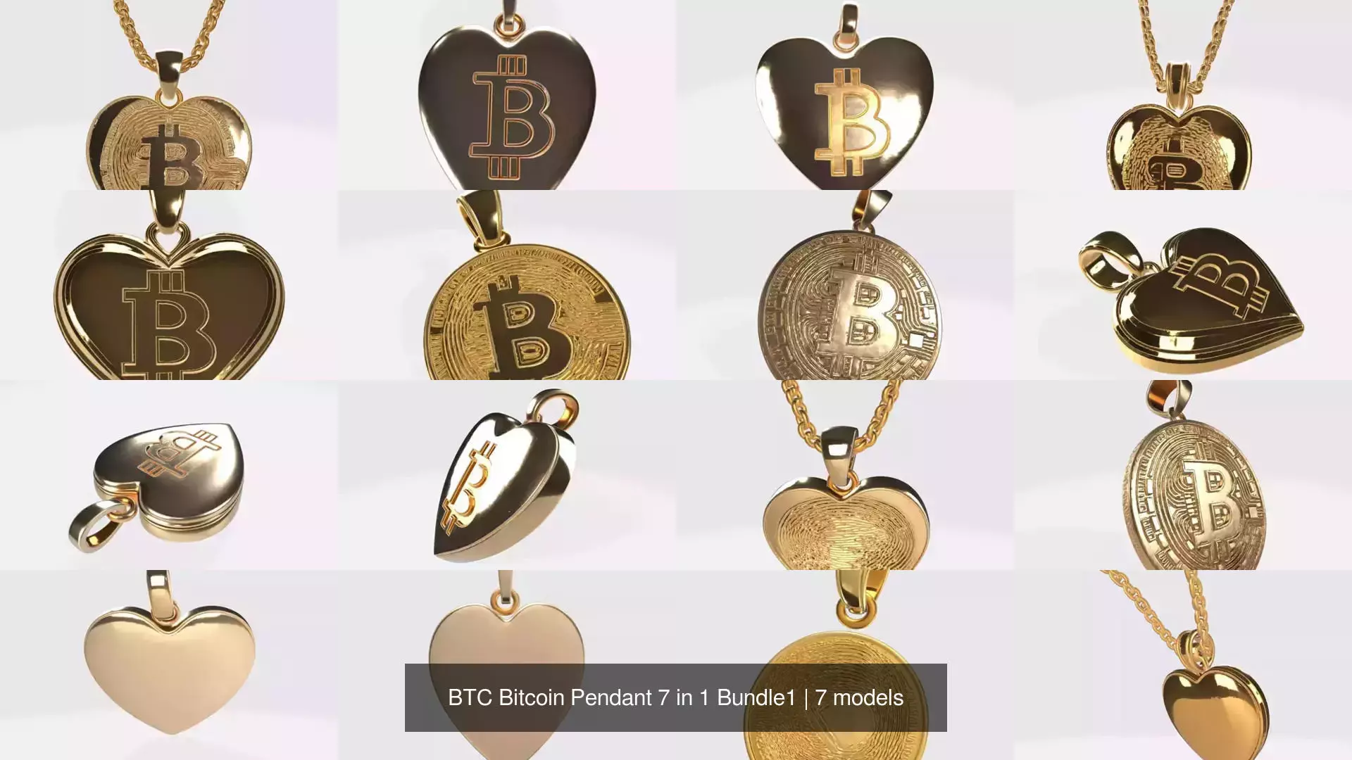 Collection 7 in 1 of BTC Bitcoin Pendant 3D Model for 3D print, Necklace Jewelry and Keychain.