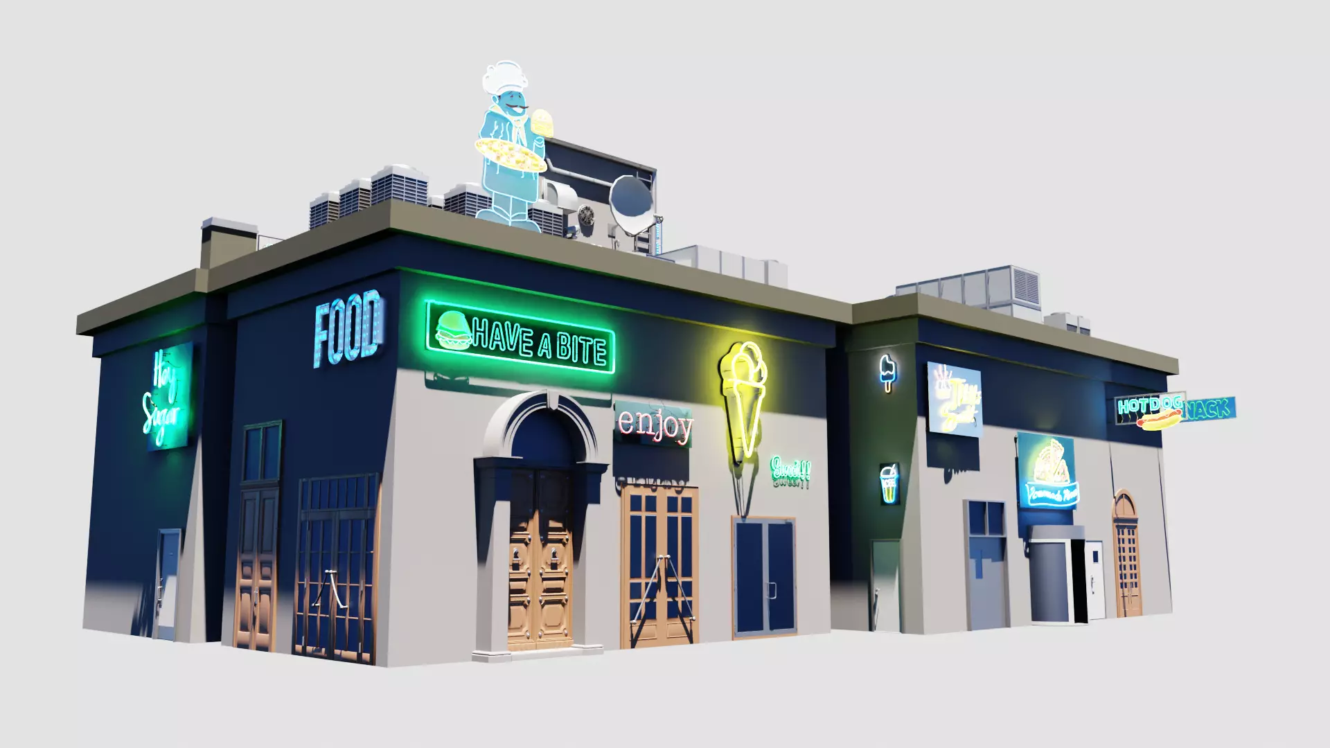 Variety of building components, including walls, windows, doors, roofs, neon, ornaments and decorative.Easily customizable, allowing you to mix and match different components.