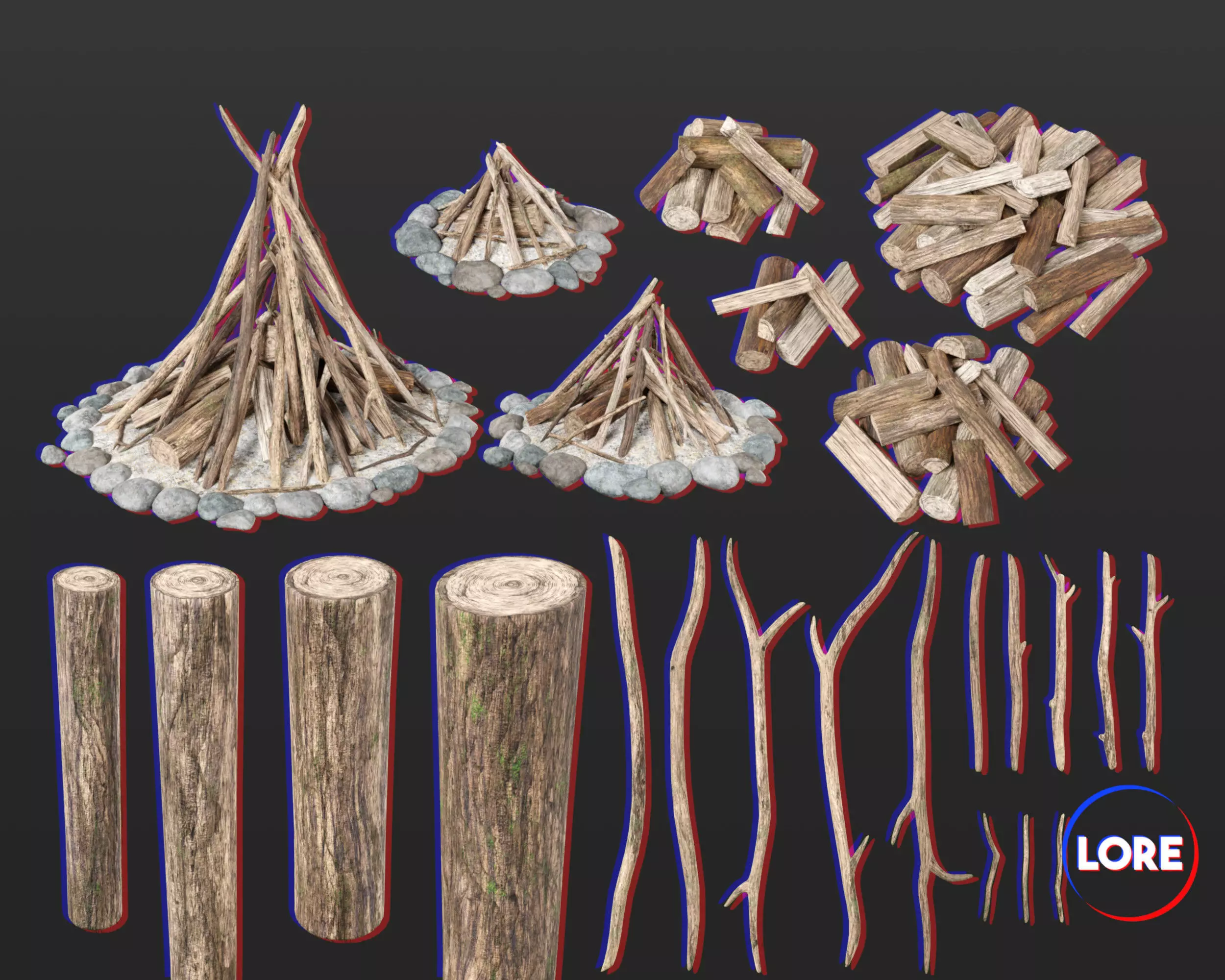 Campfires (3 Models), Firewood Building Set (16 Models), Logs Building Set (9 Models), and Sticks Building Set (15 Models)