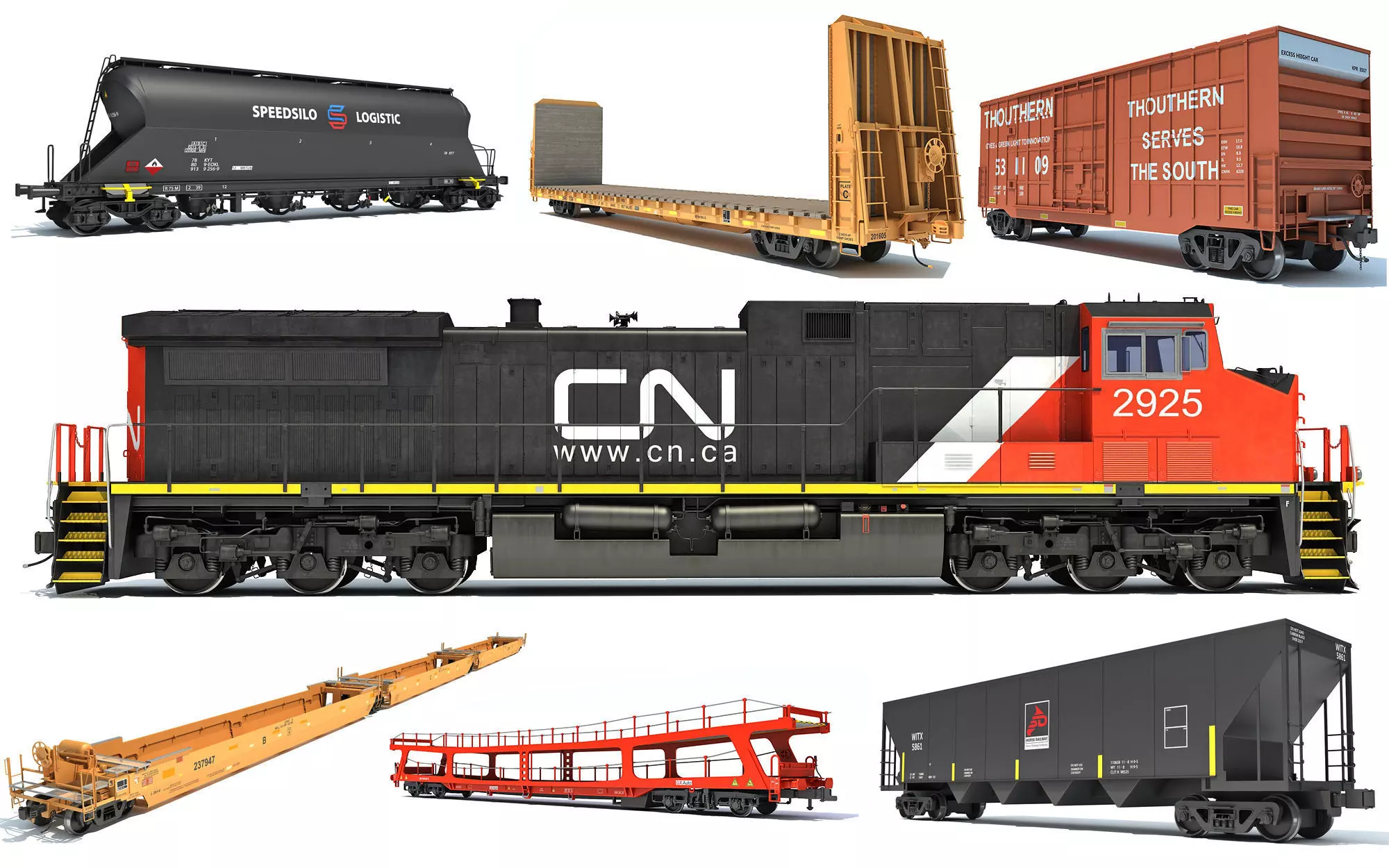 High detailed Canadian National locomotive with 6 railroad car collection.For additional info, turntables and more preview renders, or if you want to get separate models, please search our catalog.