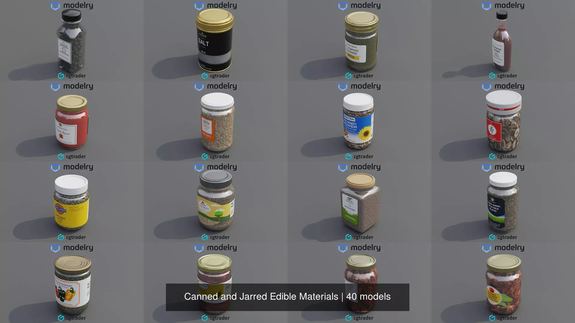 the collection of 40 Canned and jarred edible materials modelled based on AI references.