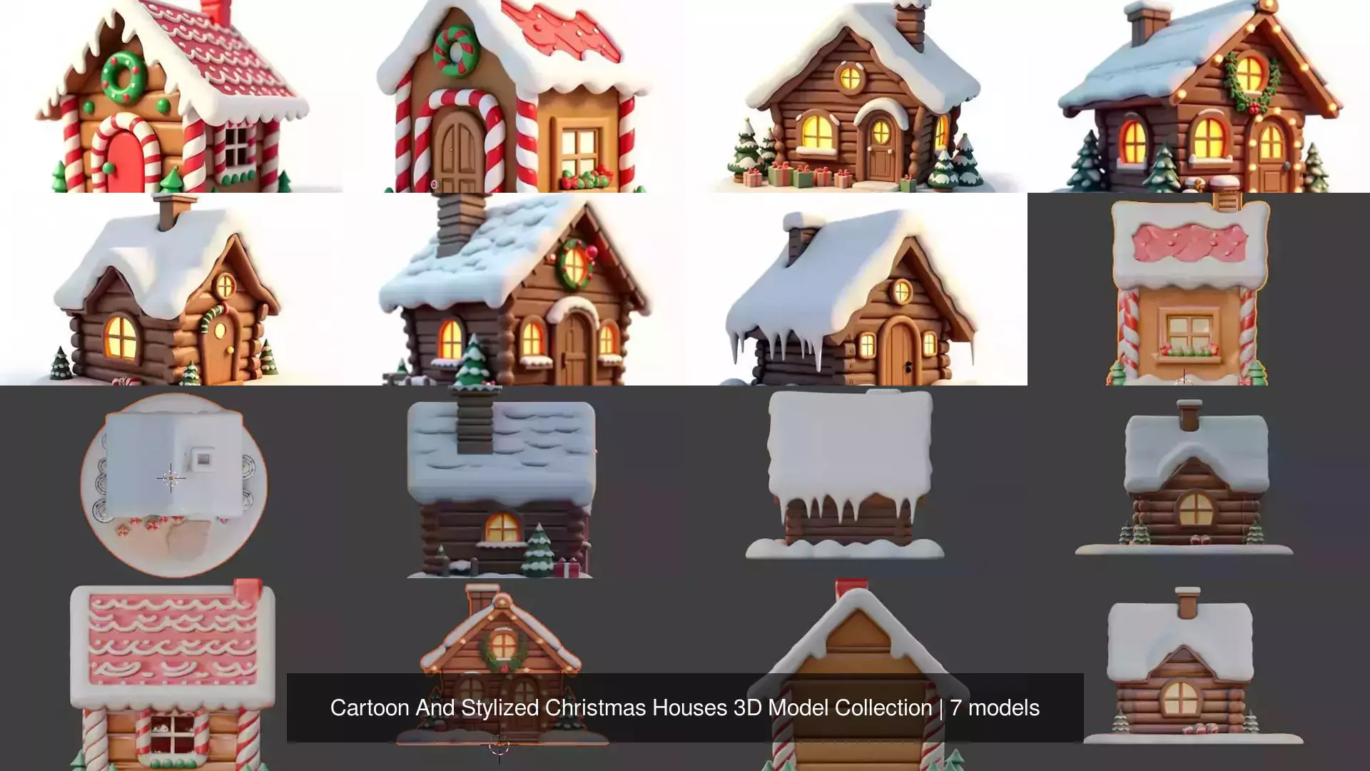 A cheerful Christmas-themed 3D model collection featuring cartoon and stylized gingerbread houses along with a simple winter wooden cabin.This collection is designed to create cozy, festive environments perfect for Christmas villages, winter scenes, holiday games, animations, and seasonal visualizations.