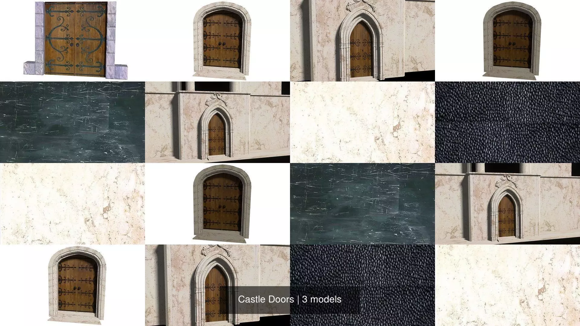 This is a collection of castle-like doors with wood and iron materials, creatged using Blender. I will add more door models in a few months.