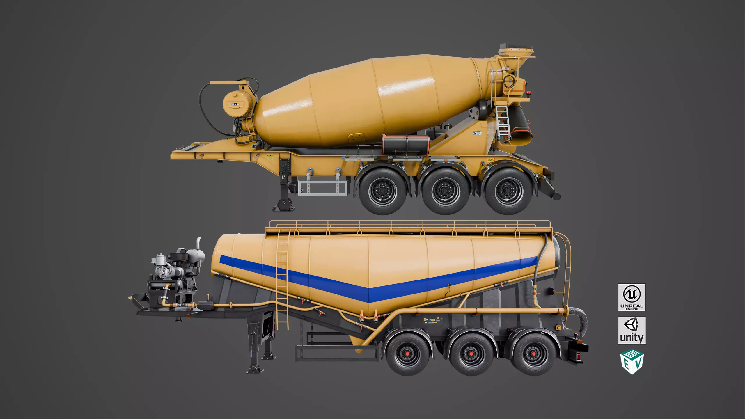 The Photorealistic 3D model of Cement Mixer and Trailer Yellow Rigged. This model is suitable for any visual production - broadcast, high-res film close-ups, advertising, games, design visualization, forensic presentation, etc,.