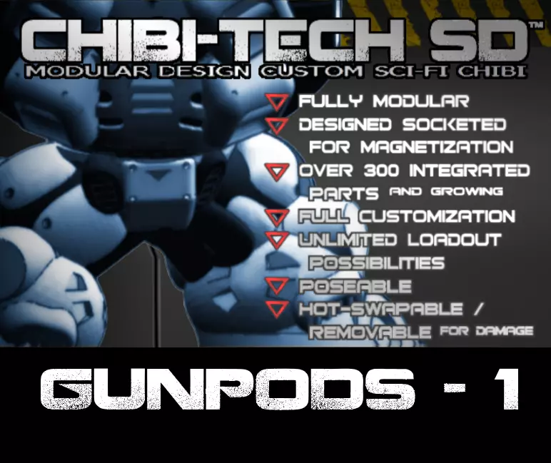 This file pack contains the FULL SERIES-1 COLLECTION of GUNPOD MODULES from the CHIBI-TECH SD lineup, plus ALTS, and ALL STAT CARDS for the included Modules.