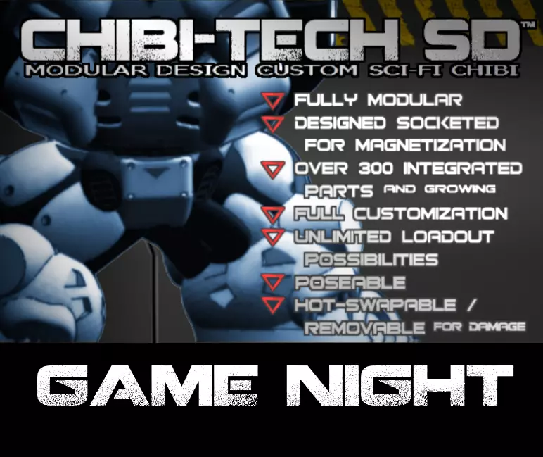 CHIBI TECH SD GAME NIGHT BUNDLECHIBI-TECH SD modular Mecha. 30mm chibi (super-deform) sci-fi tabletop miniatures series come with a single-piece .STL and FDM-optimized versions for quality supportless printing. Many include free alternate variant sculpts. Also includes ready-to-print .PNG format GAME CARD(S). Designed to be 100% modular by using 6x1.5mm neodynium magnets.