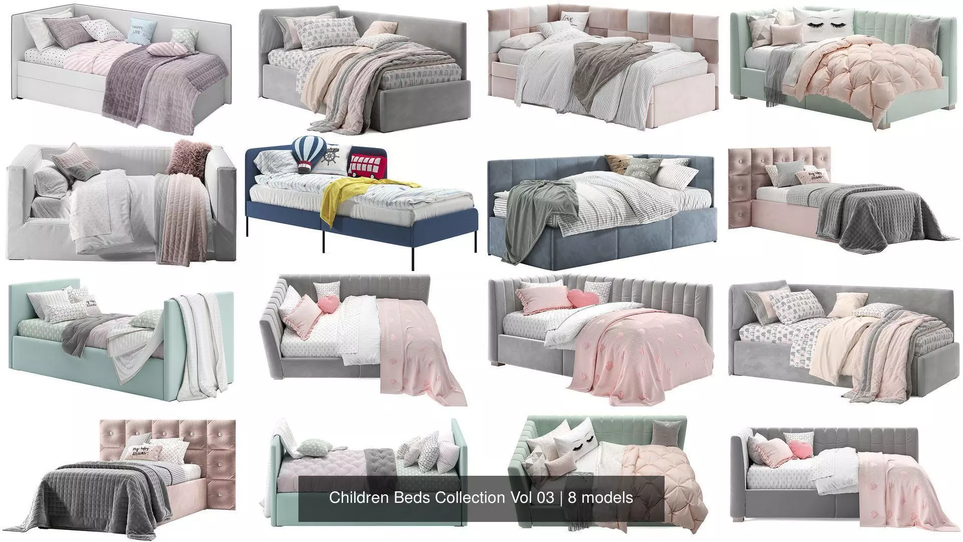 Include 8 Bed and Daybed In 16 colorsModels: Corner bed and Single bed with pillow panels **Mattress Size: 200 * 90 Bed Size: 215 * 100 * 95Polys: 537.951 Verts: 523.128 Polys: 736.769 Verts: 755.086**Bon Corner BedMattress Size: 200 * 90 Bed Size: 210 * 105 * 85Polys: 474.789 Verts: 475.479 Polys: 375.335 Verts: 376.035** IKEA BLÅKULLEN upholstered bed frame with corner headboard**Mattress Size: 200 * 90 Bed Size: 210 * 100 * 85Polys: 436.613 Verts: 437.460 Polys: 607.069 Verts: 606.694RH Brook Slipcovered DaybedBed Size: 230 * 140 * 95Polys: 733.106 Verts: 730.783 Polys: 831.091 Verts: 833.139PBTeen Avalon Upholstered Corner Storage BedMattress Size: 100 * 195 Bed Size: 215 * 125 * 95Polys: 863.264 Verts: 864.036 Polys: 824.798 Verts: 832.958Corner Bed With two different PanelsMattress Size: 90 * 200 Bed Size: 215 * 105 * 85 Bed Size: 220 * 115 * 85Polys: 590.495 Verts: 581.284 Polys: 590.949 Verts: 595.742Iorca Bolzan LettiMattress Size: 90 * 200 Bed Size: 215 * 105 * 90Polys: 442.683 Verts: 443.537 Polys: 714.832 Verts: 709.940Bert Sofa Bed - One SideMattress Size: 190 * 90 Bed Size: 200 * 100 * 85Polys: 451.841 Verts: 452.621 Polys: 444.883 Verts: 437.321