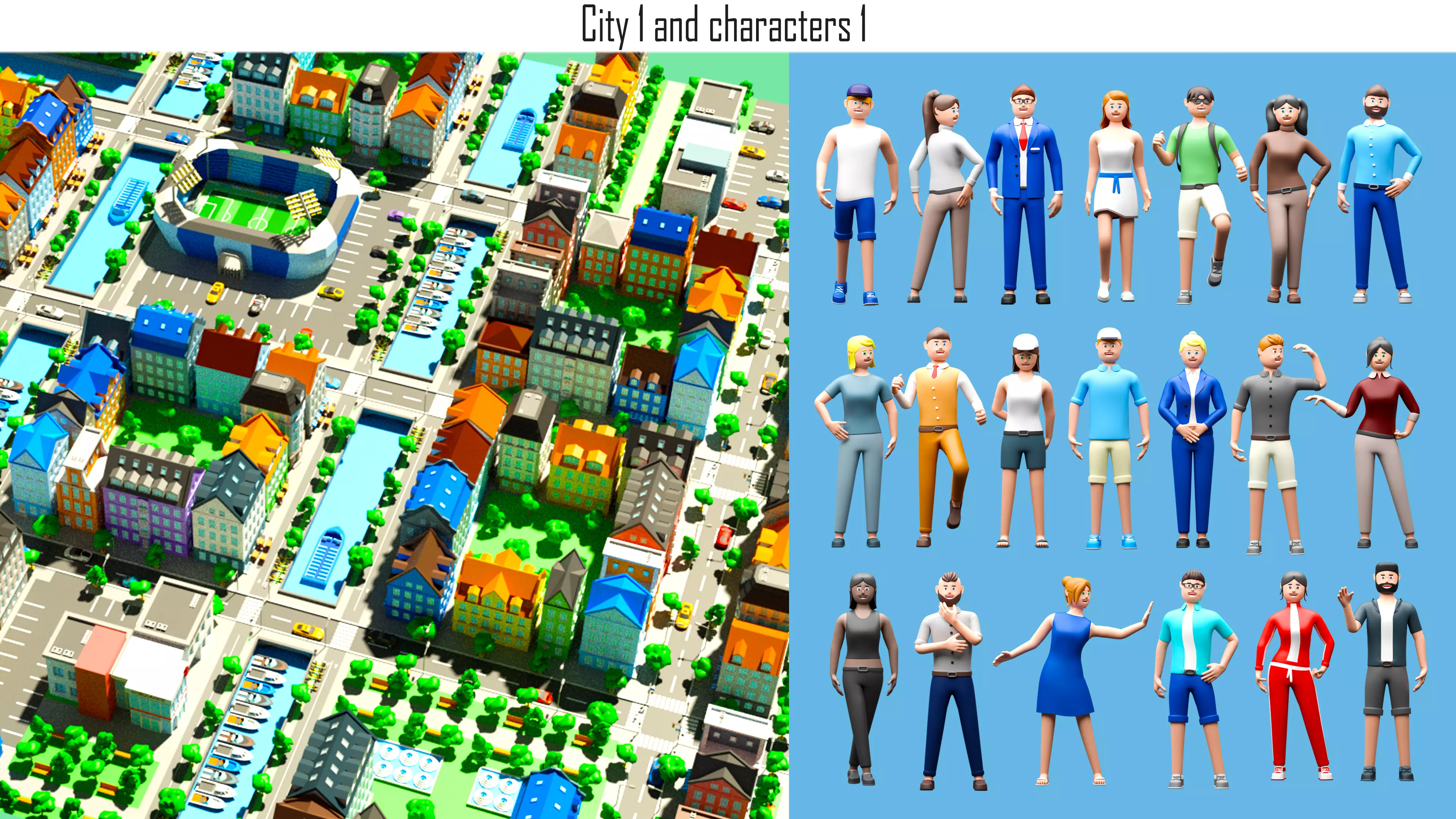 Tile city 3d low poly! 70 unique objects!. Includes 28 buildings, 13 vehicles and cars, stadium, parks, landscape and more. The package has all the components to create any city! Used for games, rendering, advertising. One texture and one material is used for the whole set. In the files you can find the set and collected cities. You can download files are: blender\ maya\ cinema 4D\3dsmax\ fbx \ obj The city is divided into sections of 10 meters . You can move the sections with the reference to meters. The city is very easy to assemble! If you liked this set, please leave a review! It will help me create an even bigger product and make you happy! Creativity to you!