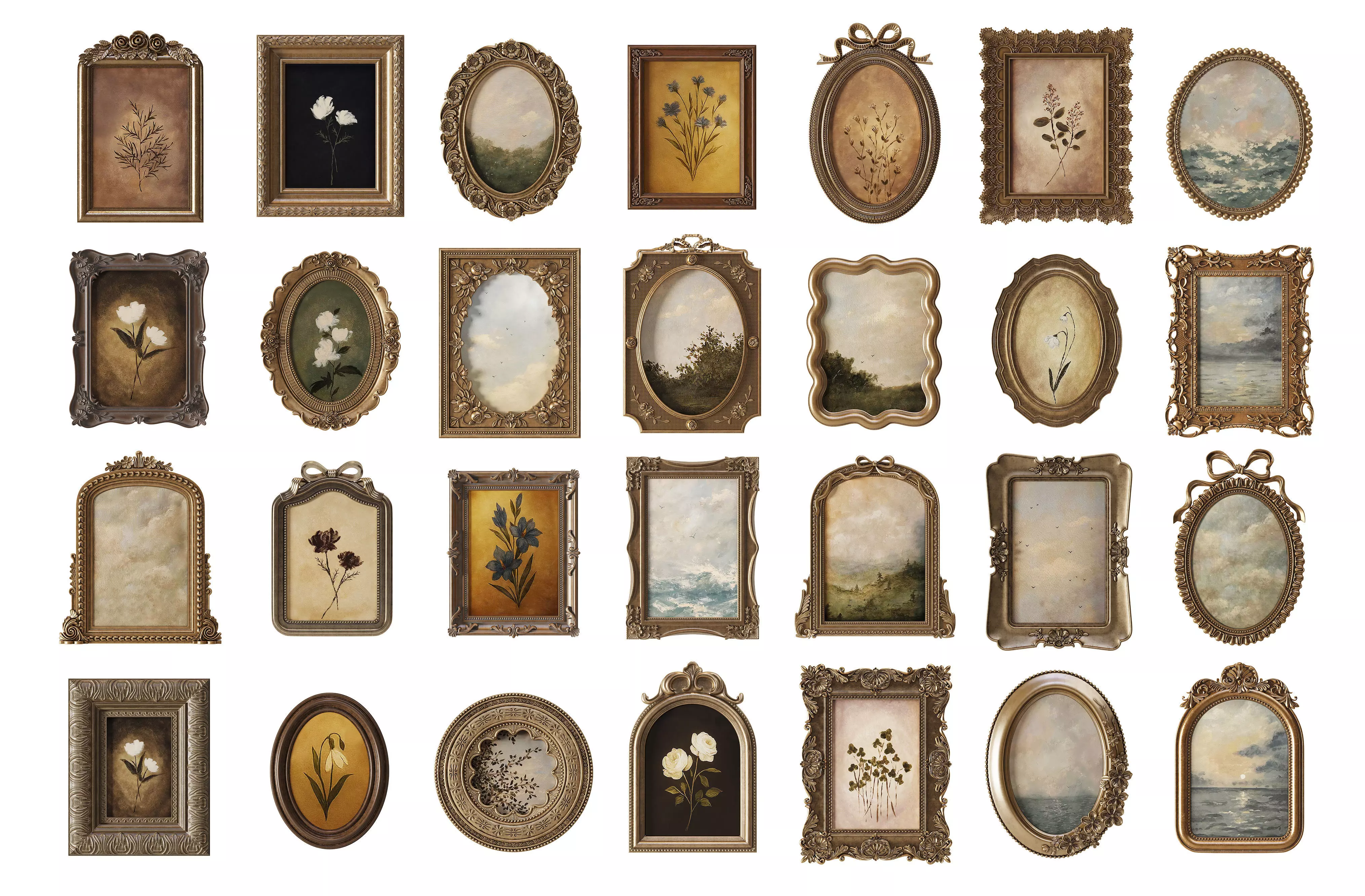 Classic pictures in classic frames for interior28 classic frames in different shapesThis collection contains 7 sets of 4 hi-quality low-poly models of classic picture framesModels are made in 3ds max+Corona render