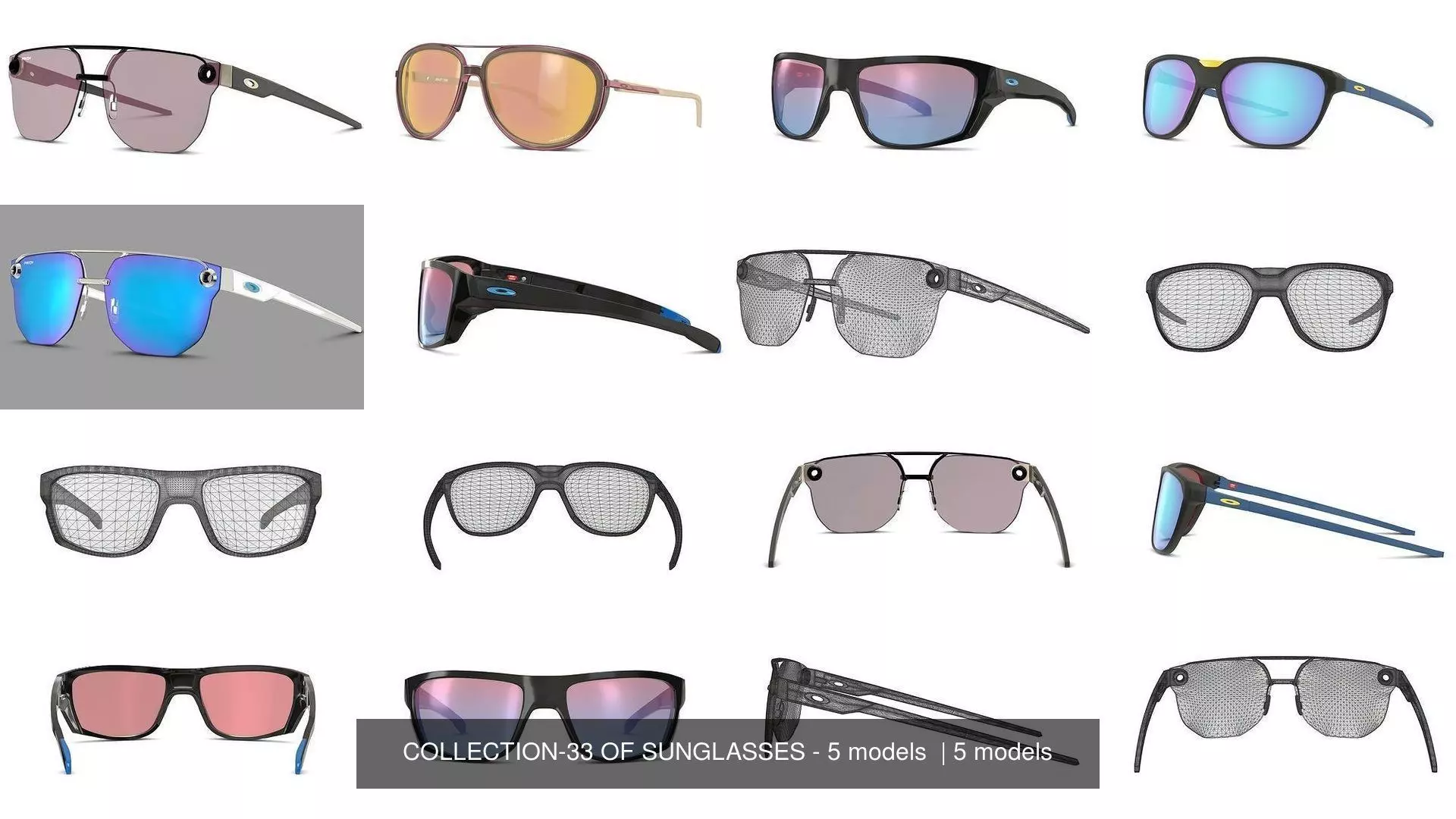 Collection of iconic sunglasses, sport glasses, optical frames featuring all brands. High-quality, photo-realistic model built according to real-world scale. Made for Real Time use for AR, VTO and more. Rendered with Blender Eevee, textures in GLB. File Formats : OBJ, GLB, MTL, FBX