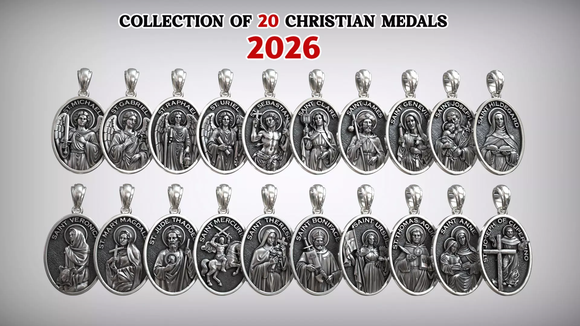 Collection of 20 Christian Saints Medallions Complete Religious Pendant Set 3D Models