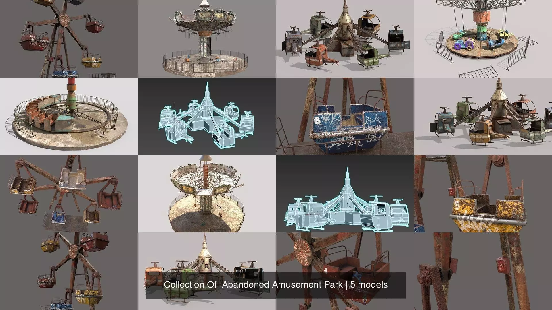 Set of Carousels In Abandoned Amusement Park . Models are very realistic. All models has PBR material. All maps are diffuse-specular-glossiness-height and normal. All model's textures has two sizes; 4096x4096 - 2048x2048 and maps are PNG formats .