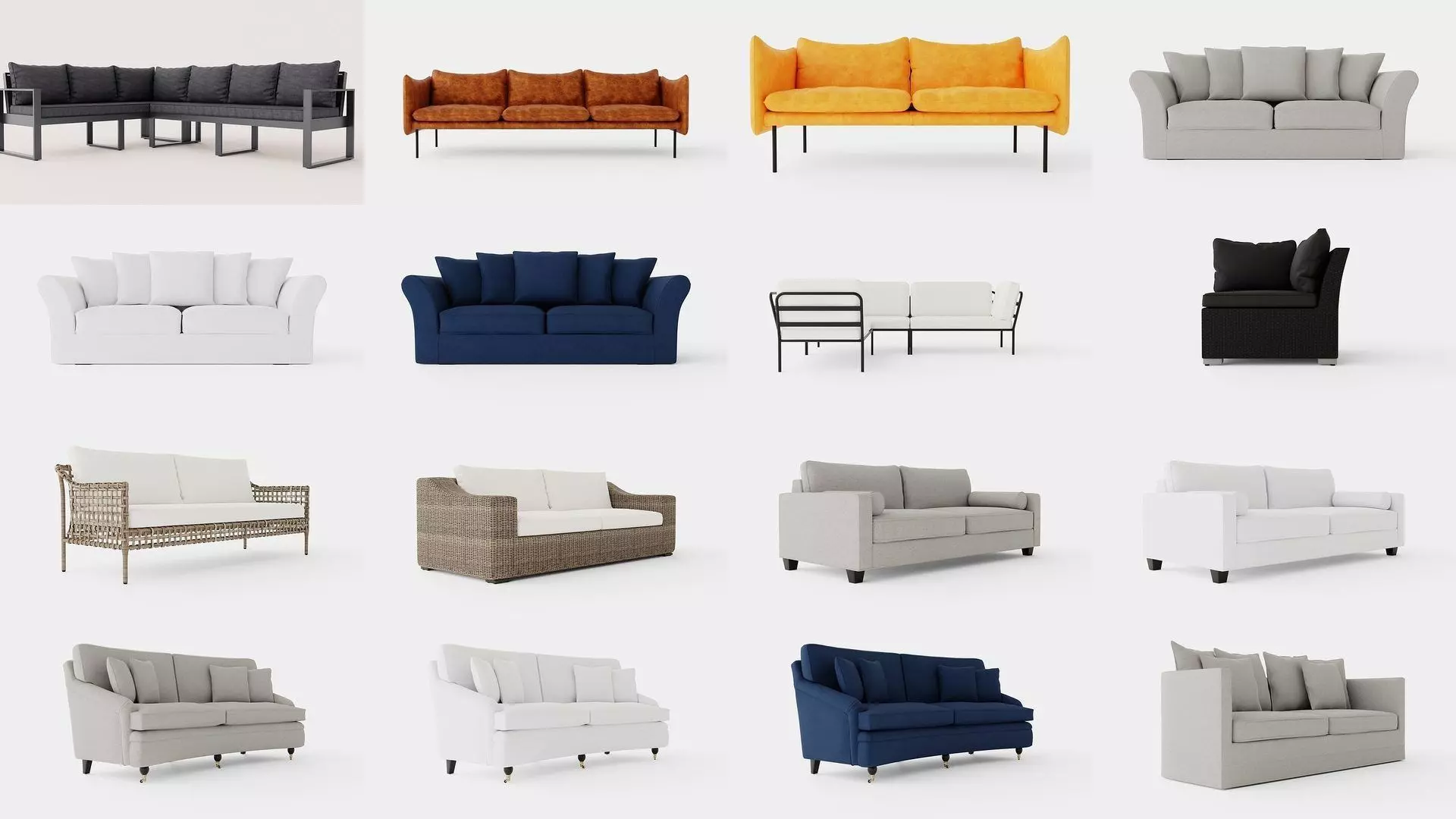 Introducing our extensive collection of 3D sofa models, expertly crafted to cater to the needs of augmented reality (AR), virtual try-on (VTO), game simulations, product design, and architectural visualizations. This diverse collection features a wide range of styles, from sleek modern and contemporary designs to classic, vintage, and luxurious pieces, each designed with high-quality textures, realistic proportions, and meticulous craftsmanship.