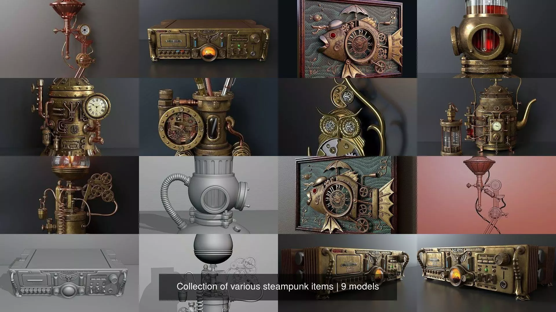 A collection of various items in the steampunk style. The collection contains items for various purposes: a lamp, a tape recorder, a wall bas-relief, a clock, a kettle, etc. All these items are made in the steampunk style.