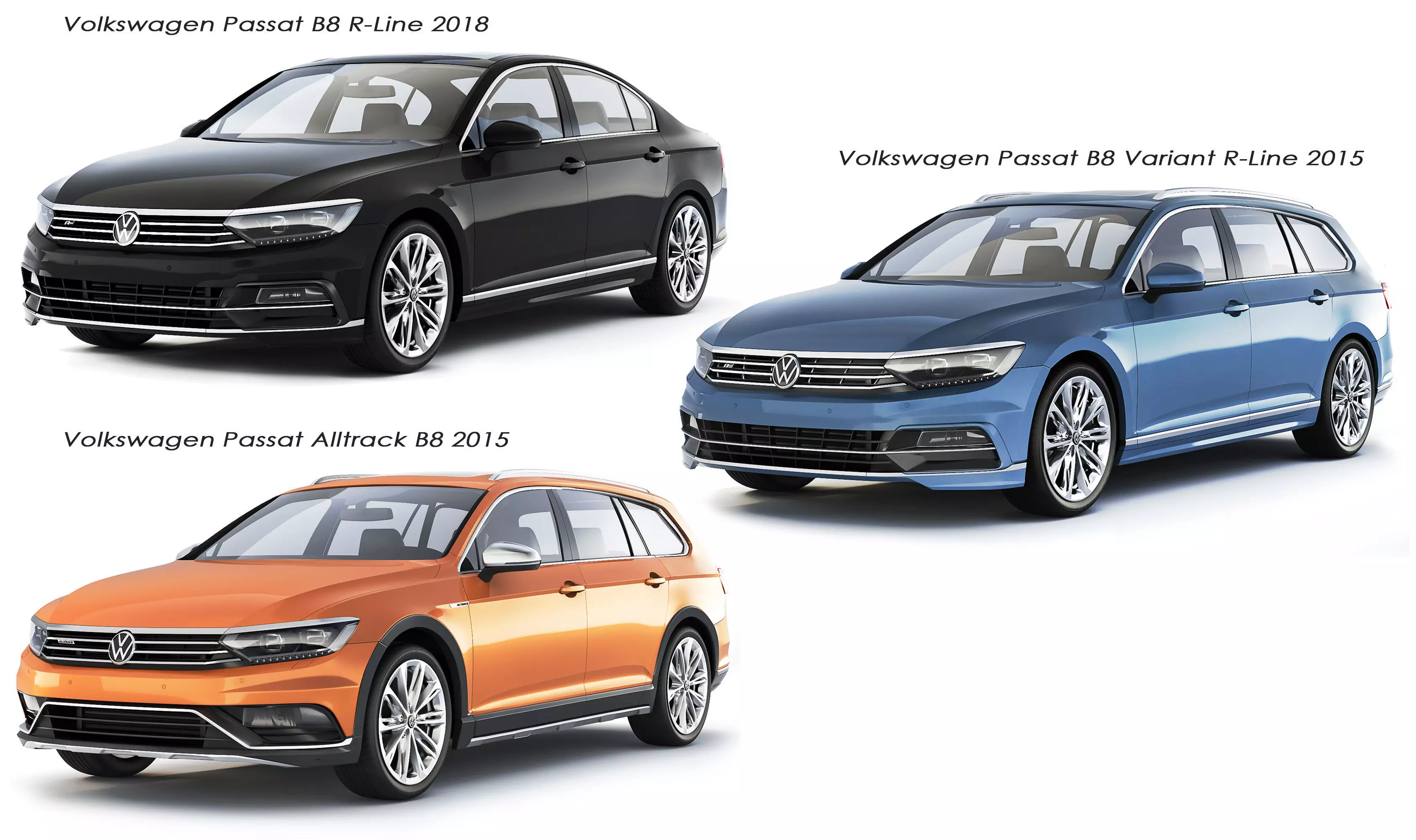 Collection of Volkswagen Passat B8 cars in different body types: sedan, station wagon, alltrack. The main elements are prepared for TurboSmooth smoothing (2 Iteration). The elements of the body, wheels, interior have been worked out - conditionally.