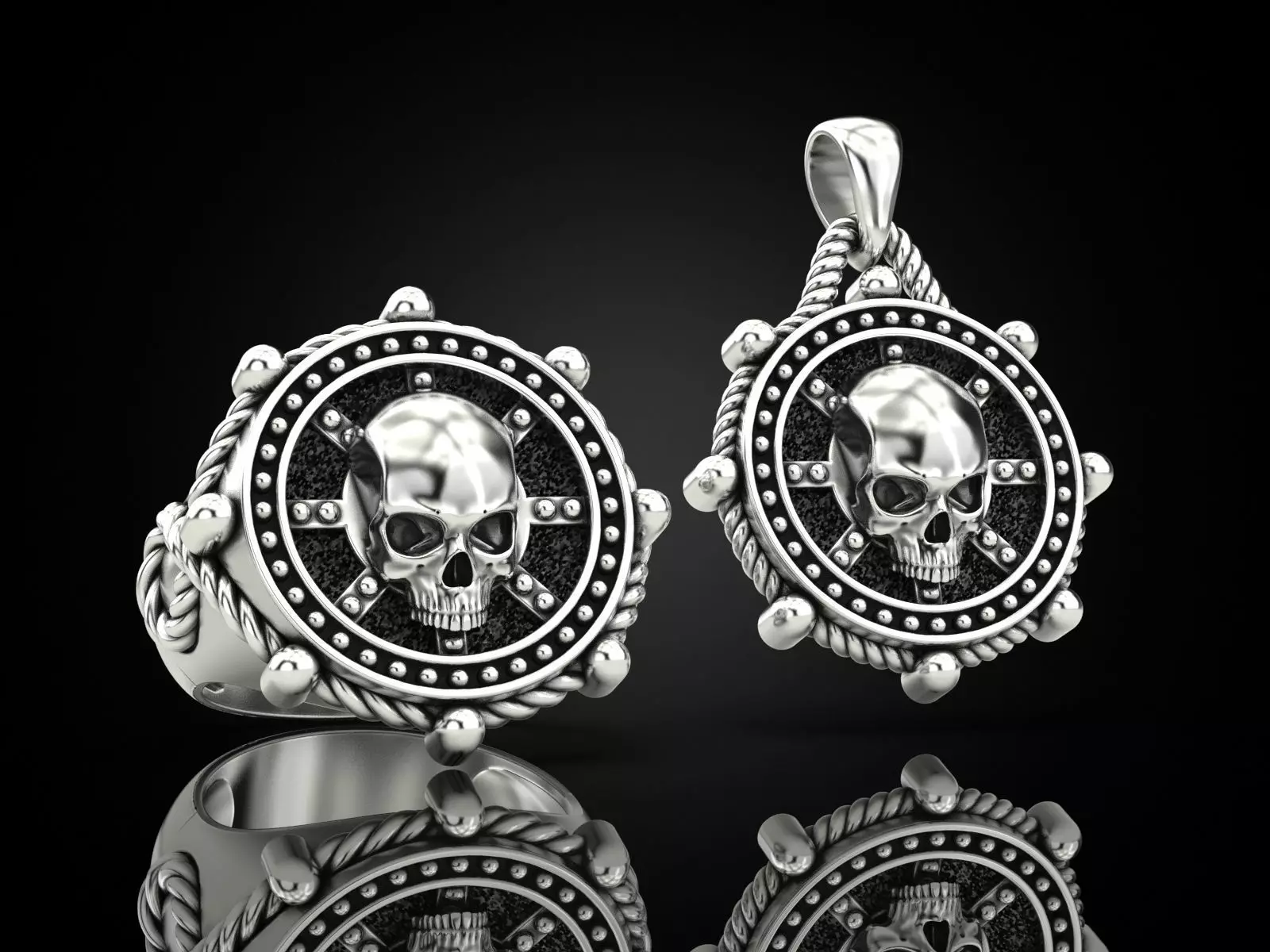 Hello friends!Collection Ships rudder and skull - includes pendant and ring.I remind you that this is only 3d model, in order for you to get the finished product you need to contact a jewelry company