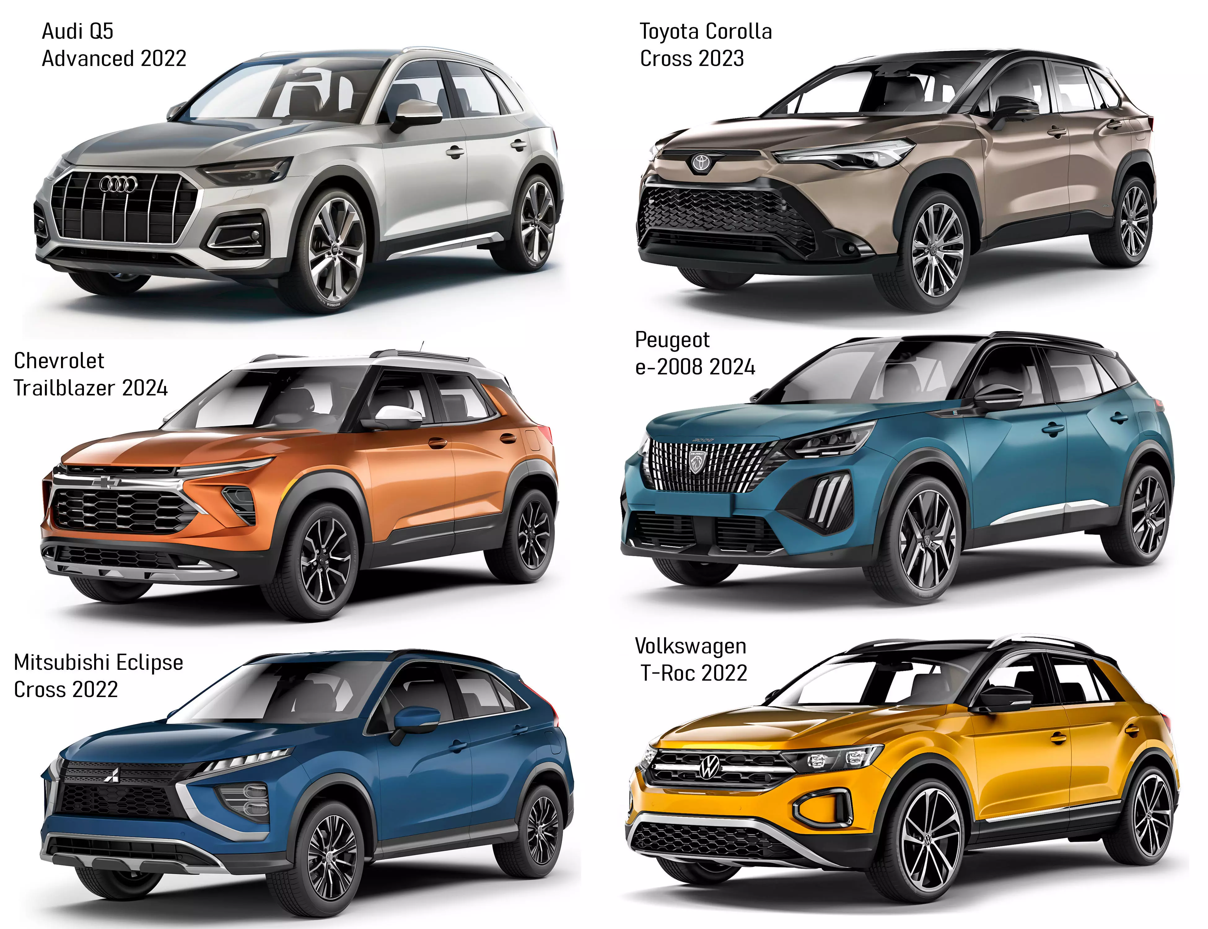 Compact suv collection. The kit includes: Volkswagen T-Roc 2022, Mitsubishi Eclipse Cross 2022, Peugeot e-2008 2024, Audi Q5 Advanced 2022, Chevrolet Trailblazer 2024, Toyota Corolla Cross 2023. The main elements are prepared for TurboSmooth smoothing (2 Iteration). The elements of the body, wheels, interior have been worked out - conditionally.