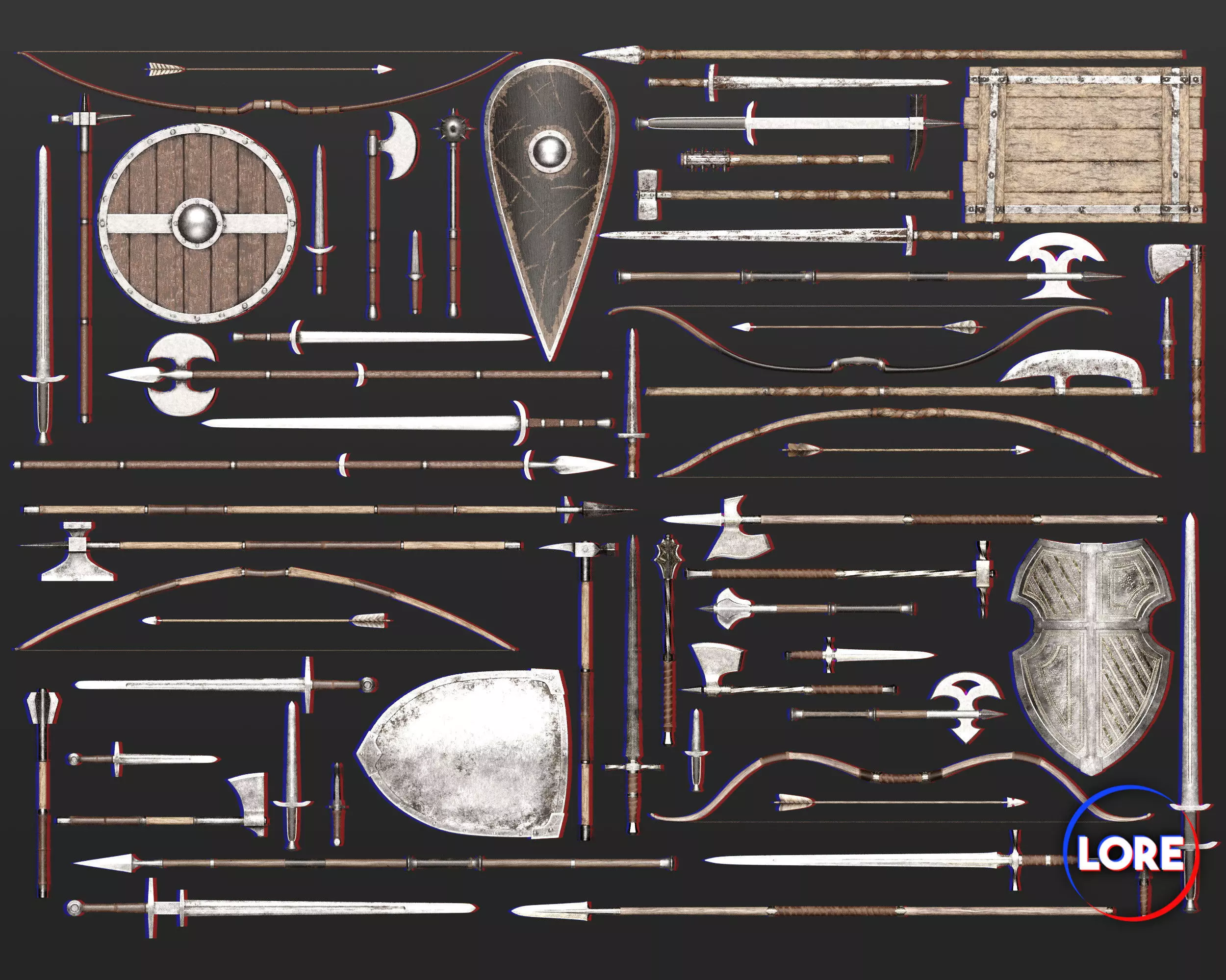 - Axe, Bow + Arrow & Quiver, Crossbow + Bolt, Dagger + Sheath, Knife + Cover, Lance, Long Sword, Mace, Pole Axe, Shield, Short Sword + Scabbard, Spear, Throwing Knife, and Warhammer. Each weapon comes in the Crude, Common, Knightly, Elegant, and Noble styles, for a total of 100 models.