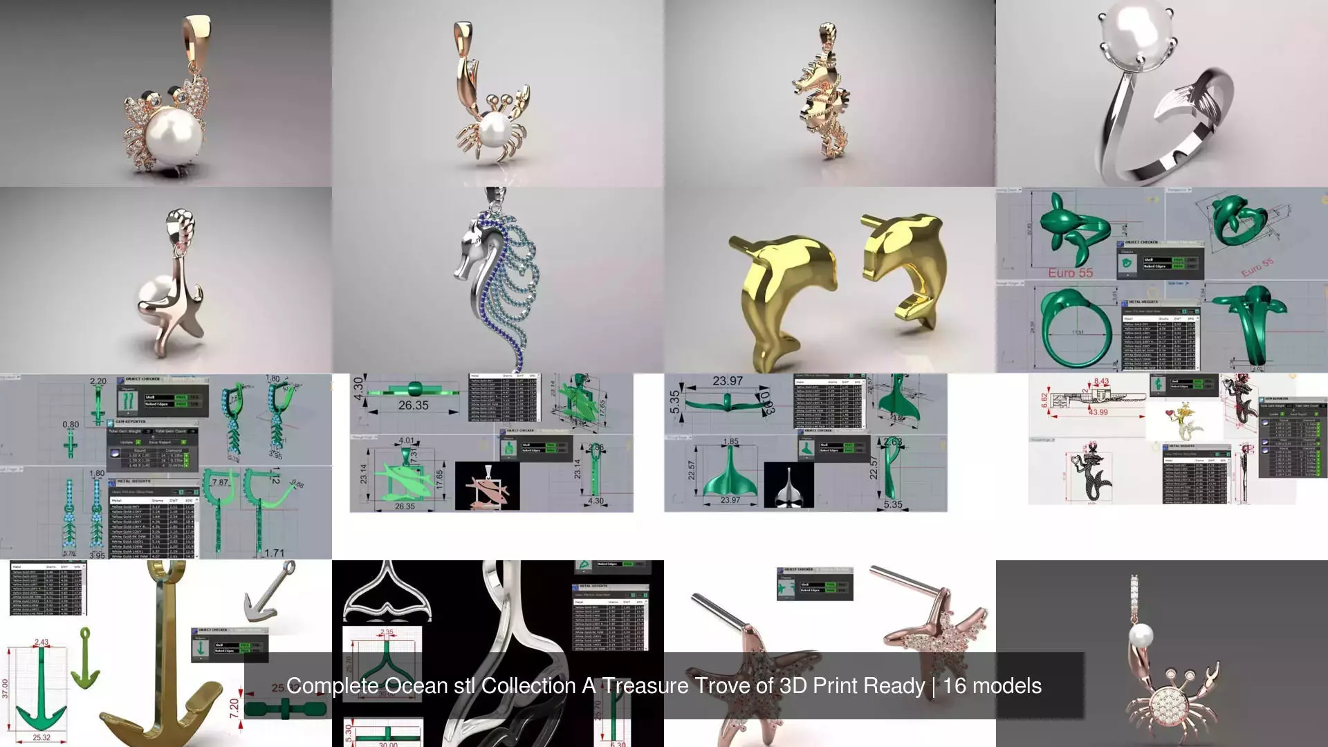 ** Full package content (16 main designs):**| File code | Product description | Jewelry type | Main elements and details || :--- | :--- | :--- | :--- || jp0327 | Mermaid Red Heart Pendant | Necklace Pendant | Gold Mermaid, Diamond Tail, Ruby (or Garnet) Heart || gr0137 | Minimal Dolphin Ring | Ring | Silver Dolphin, Volumetric and Ergonomic Design || pr0027 | Pearl Fish Wing Ring | Ring | Open Ring, Pearl in Claw, Silver Fish Wing || je0132 | Fish Skeleton Pendant Earrings | Hoop Earrings | Fish Skeleton Design, Blue Stones (Sapphire or Topaz), Silver || je0154 | Starfish Stud Earrings | Stud Earrings | Rose Gold Starfish, Scattered Stones || ge0045 | Dolphin Stud Earrings | Stud Earrings | Gold Dolphin Pair, Delicate and Minimal Design || pp0049 | Pearl Claw Crab Earrings | Pendant Earrings | Rose Gold Crab, Pearl, Body Stone || pp0031 | Single Stone Claw Crab Pendant | Necklace Pendant | Gold Crab, Pearl, Diamond Claw || pp0030 | Butterfly Claw Crab Pendant | Necklace Pendant | Rose Gold Crab, Pearl, Stone Wings || pp0037 | Pearl Starfish Pendant | Necklace Pendant | Rose Gold Starfish, Large Pearl || gp0169 | Spiral Seahorse Pendant | Necklace Pendant | Rose Gold Seahorse, Spiral Body Design || jp0259 | Wavy Seahorse Pendant | Necklace Pendant | Silver Seahorse, Blue and Turquoise Stone Mane || gp0219 | Classic Anchor Pendant | Necklace Pendant | Gold Anchor, Simple and Solid Design || gp0054 | Pisces Pendant | Necklace Pendant | Three Fish in a Square Frame, Two-Tone (Rose Gold and Silver) || gp0062 | Minimalist Fish Wing Pendant/Ring | Pendant/Ring | Fish Wing Design, Silver, Linear and Minimal || gp0089 | Minimal Helmet Ring | Ring | Bulky and Modern Design, Silver (Can Be Used as a Pendant) |