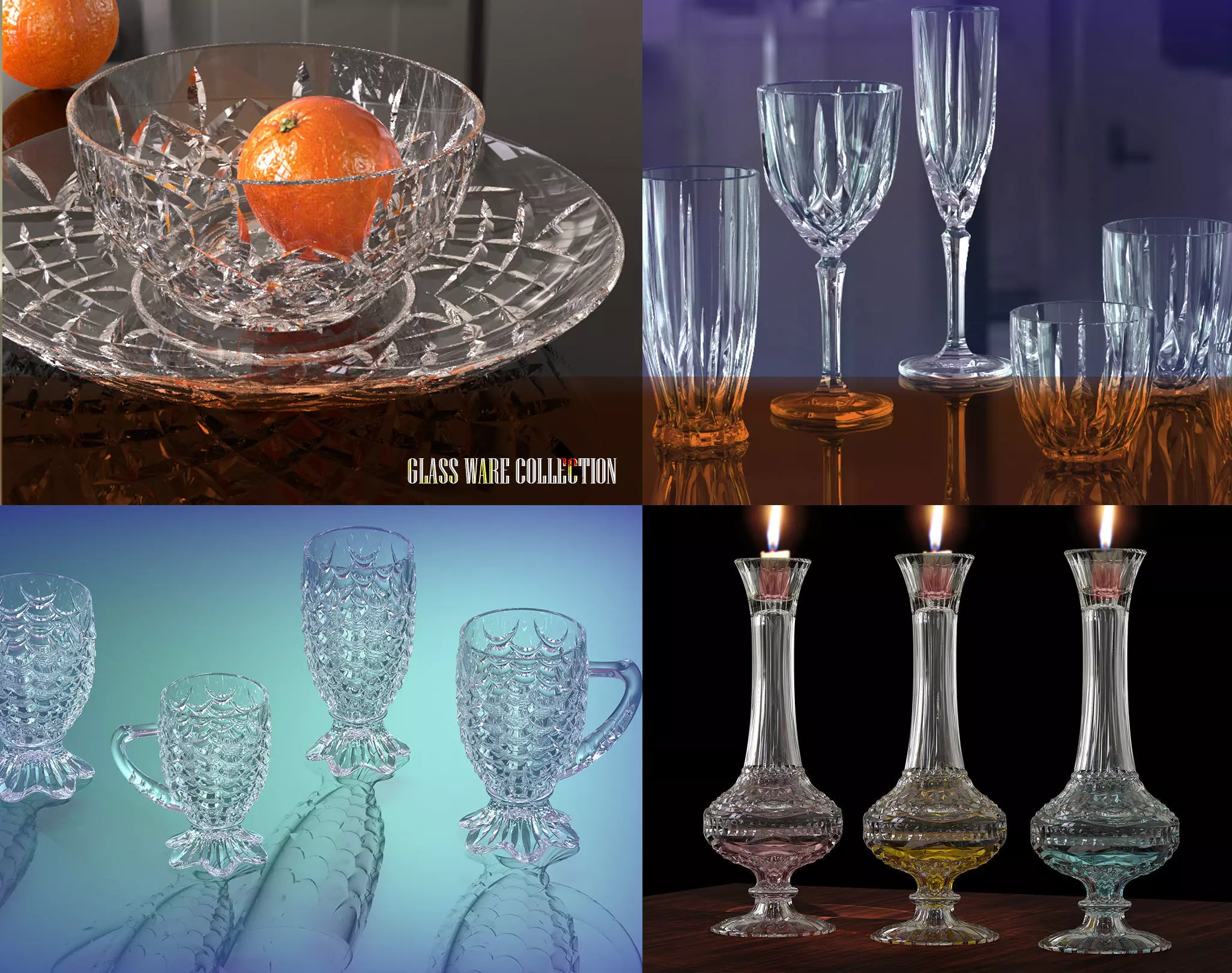 collection of crystal glass ware designs (( fish design set , arrow stemwares and tumblers , crysla plate with orange and bowls , candelholder antique ))