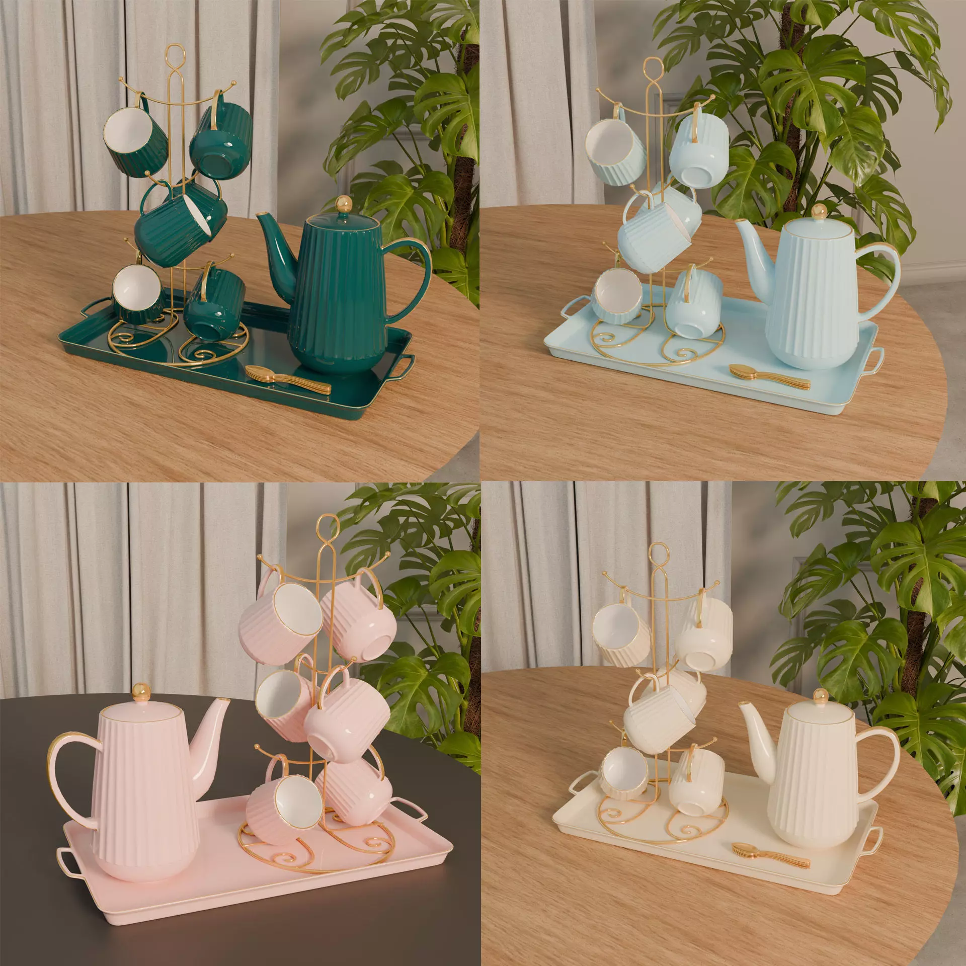 This collection includes four variations of a beautifully detailed cup set with tray and stand, each featuring a unique color scheme.Designed with realism and precision, every model maintains the same elegant design while offering a different aesthetic to match any interior or render style.