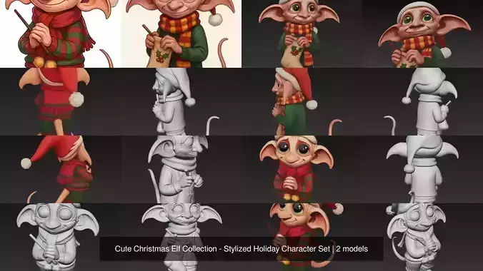 This collection features multiple adorable elf characters, each with unique poses, expressions, and holiday accessories such as gifts and stockings. The characters are sculpted with soft proportions, expressive faces, and clean surface flow, creating a warm and friendly aesthetic that instantly fits Christmas-themed environments.