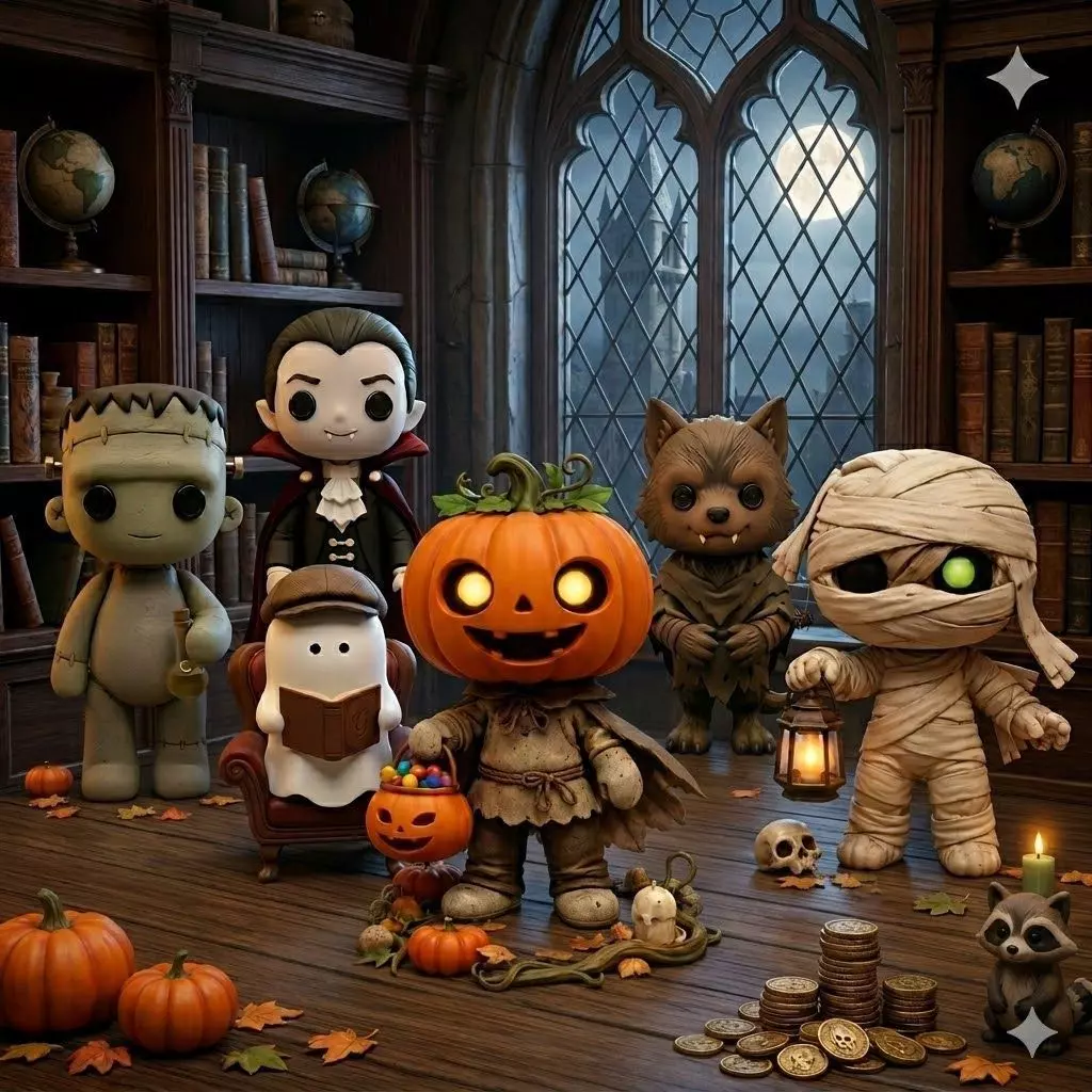 Pumpkin Trick-or-Treater with candy basketCute Mummy holding a lanternStylized Vampire figureFrankenstein-inspired creatureCozy Reading Ghost on an armchairAdorable Werewolf on decorative base