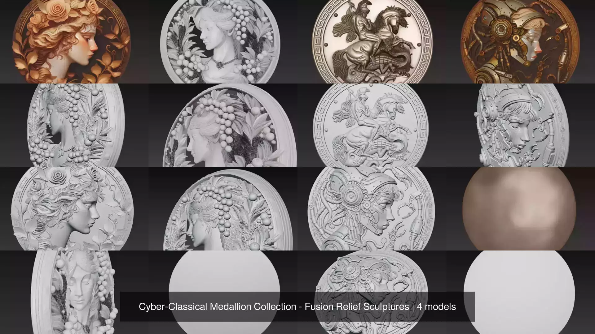 Cyber-Classical Medallion Collection - Fusion Relief Sculptures 3D Model Pack