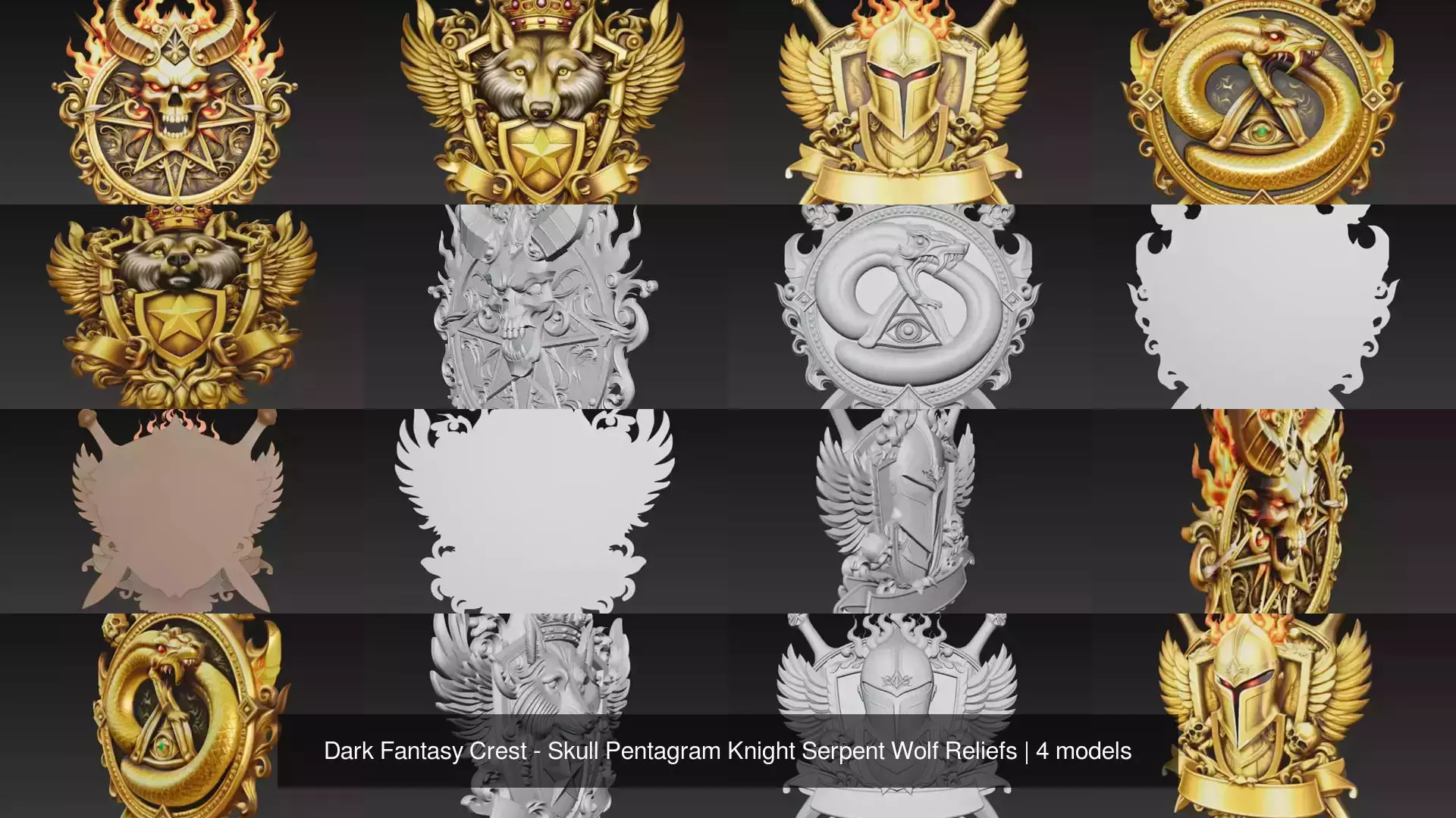 The Dark Fantasy Crest Pack is a high-detail collection of four powerful fantasy wall reliefs inspired by occult symbolism, medieval heraldry, and dark royal aesthetics. This pack combines aggressive iconography, mystical elements, and armored fantasy design into a cohesive crest series.