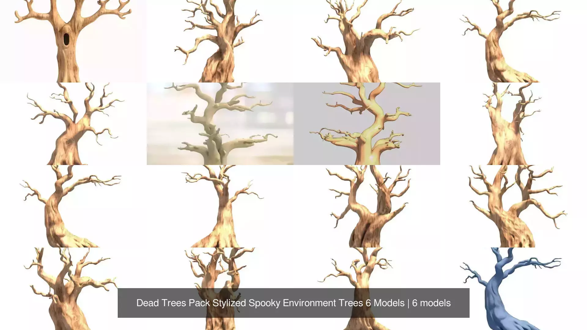 This pack includes 6 stylized dead tree 3D models, designed for creating spooky, eerie, or fantasy environments.
