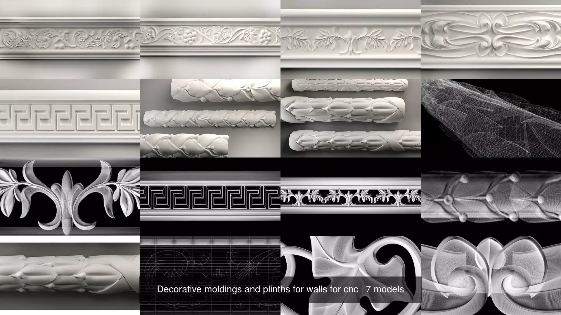 A collection of decorative moldings and plinths for walls for CNC machines.The 3d model can be used for interior decoration, creating scenes in your works, but this model was created specifically for printing on 3d printers and making milled products on machines with numerical CNC software