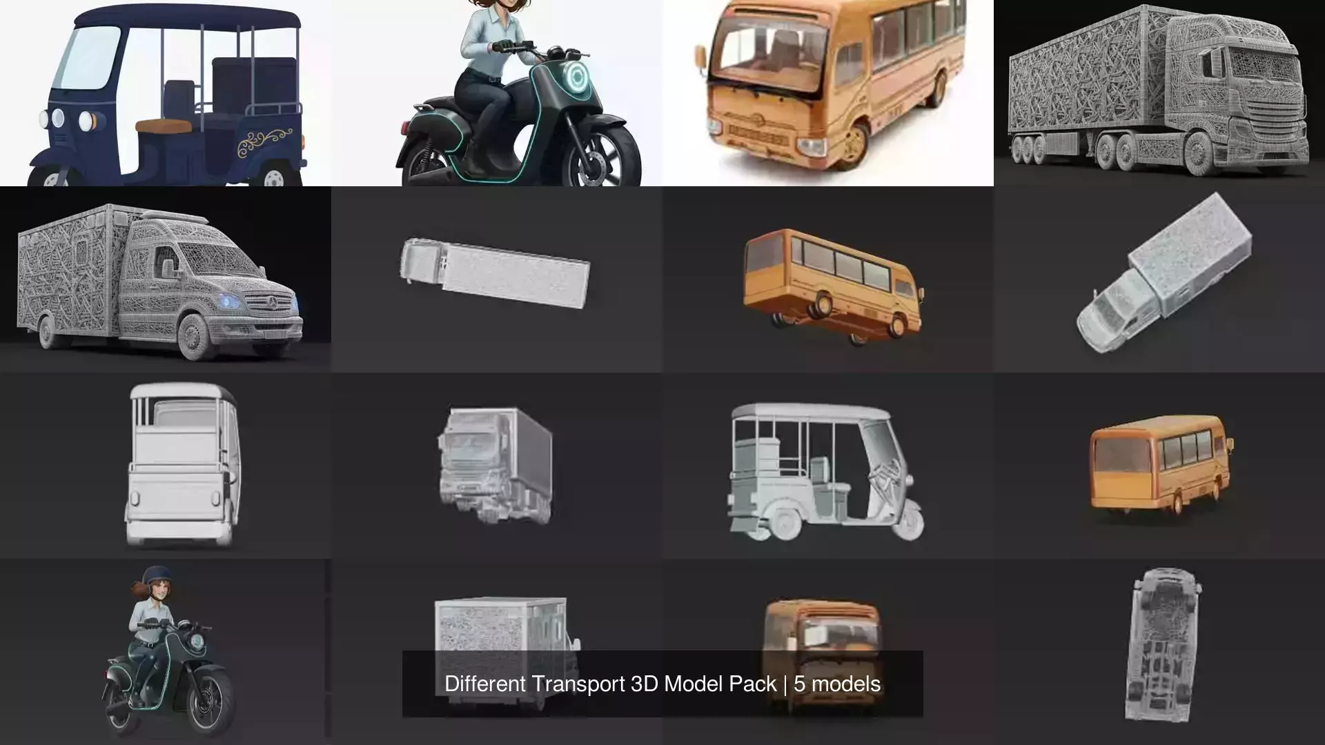 This Different Transport Pack includes a variety of transport themed 3D models designed for modern visualization, educational projects, and creative scenes. The collection features multiple vehicle types suitable for city, travel, logistics, and transportation concepts. Models are created with clean topology and balanced detailing for professional rendering and presentation use.