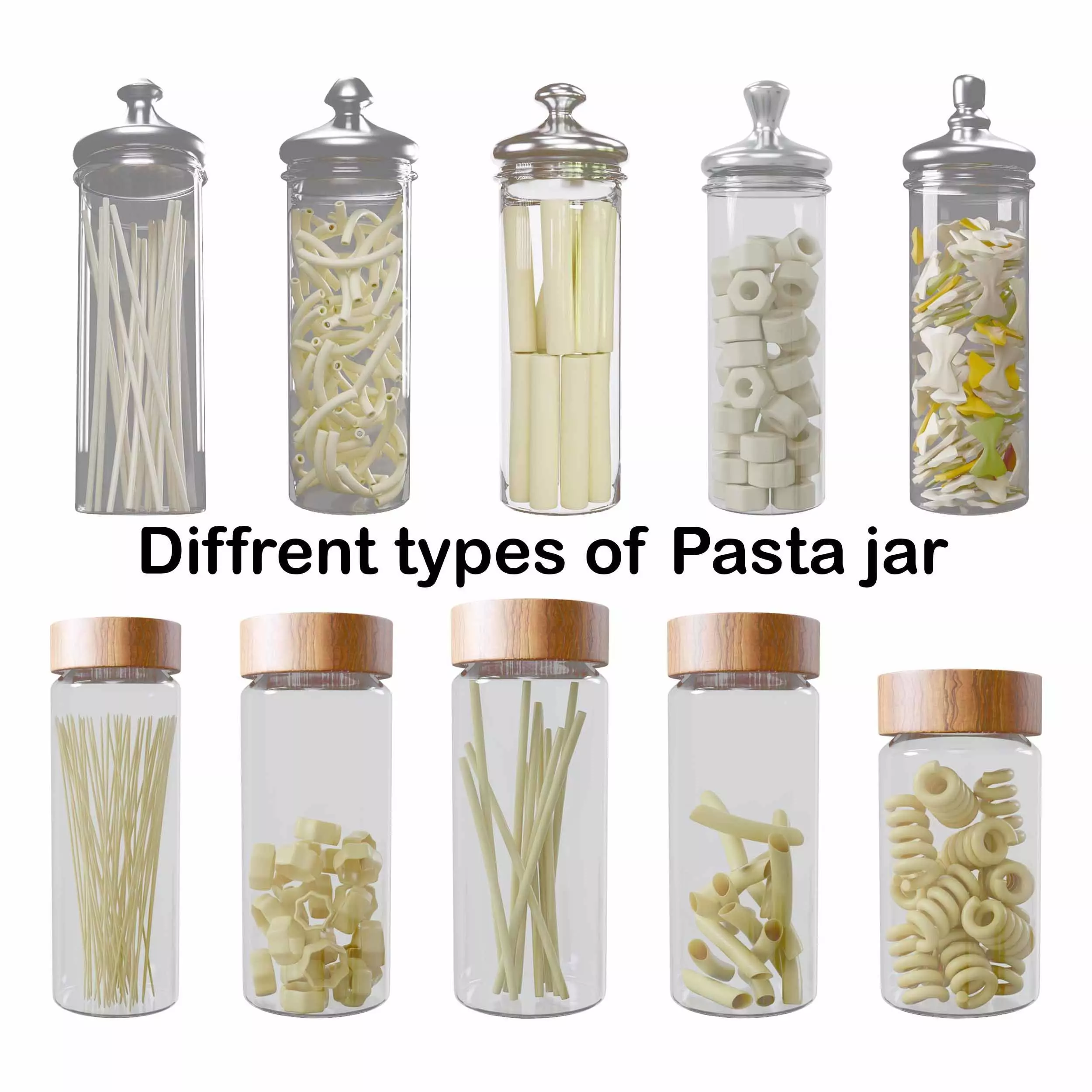 High quality Pasta Jar, and there are diffrent style pasta in diffrent diffrent jar also pasta are physical model made in blender that created for 3d product visualization. There are diffrent kind of food item called Noodles or pasta or Spaghetti Jar. This product are for intorior or kitchen or cooking or food item visualization.