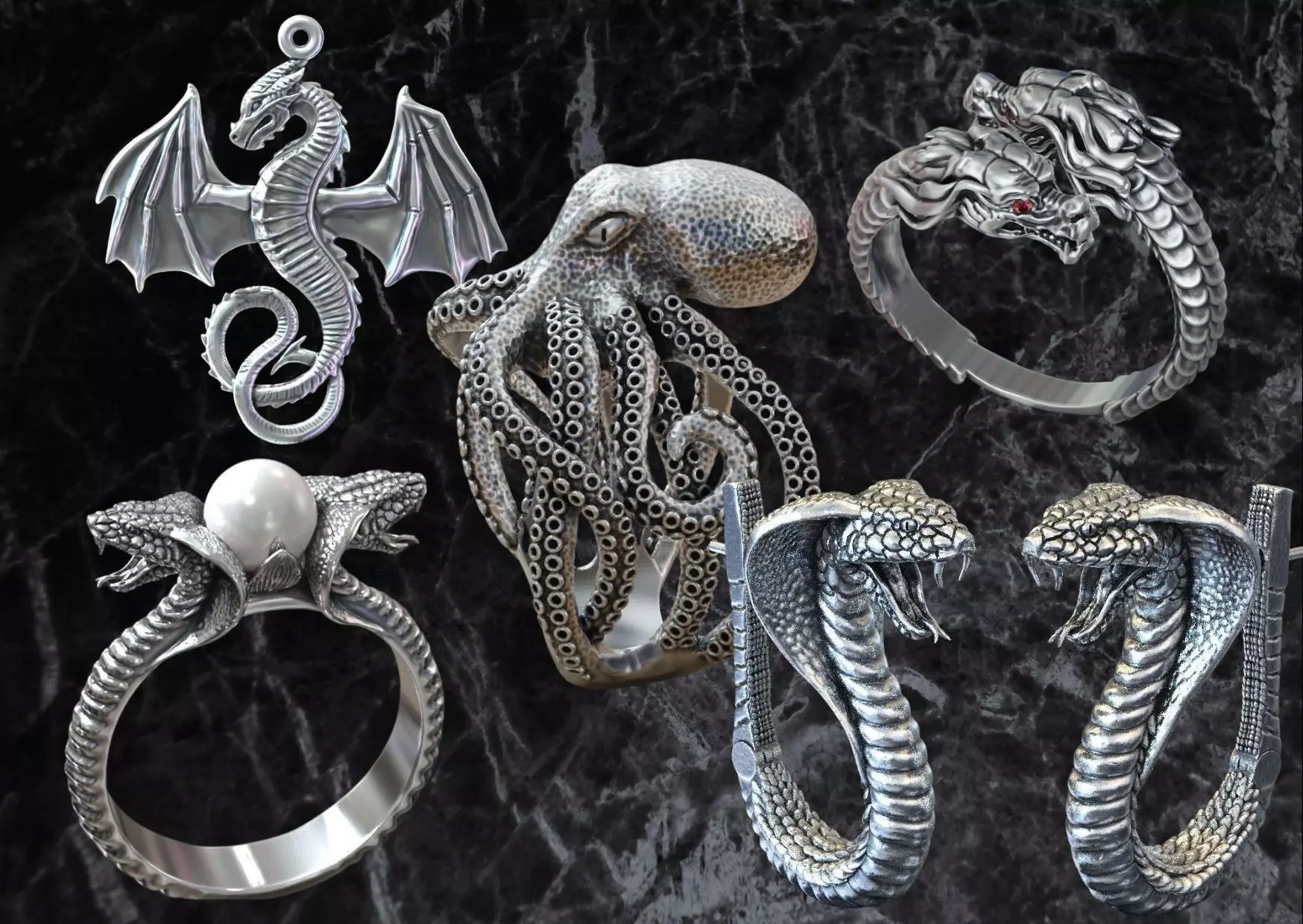 Collection of 3d models of rings for women and for men with one pair of cobra earrings, one ring with cobras and pearl, one octopus ring and one ring with dragon pendant with dragon. Feel free to ask questions about 3d models in this collection