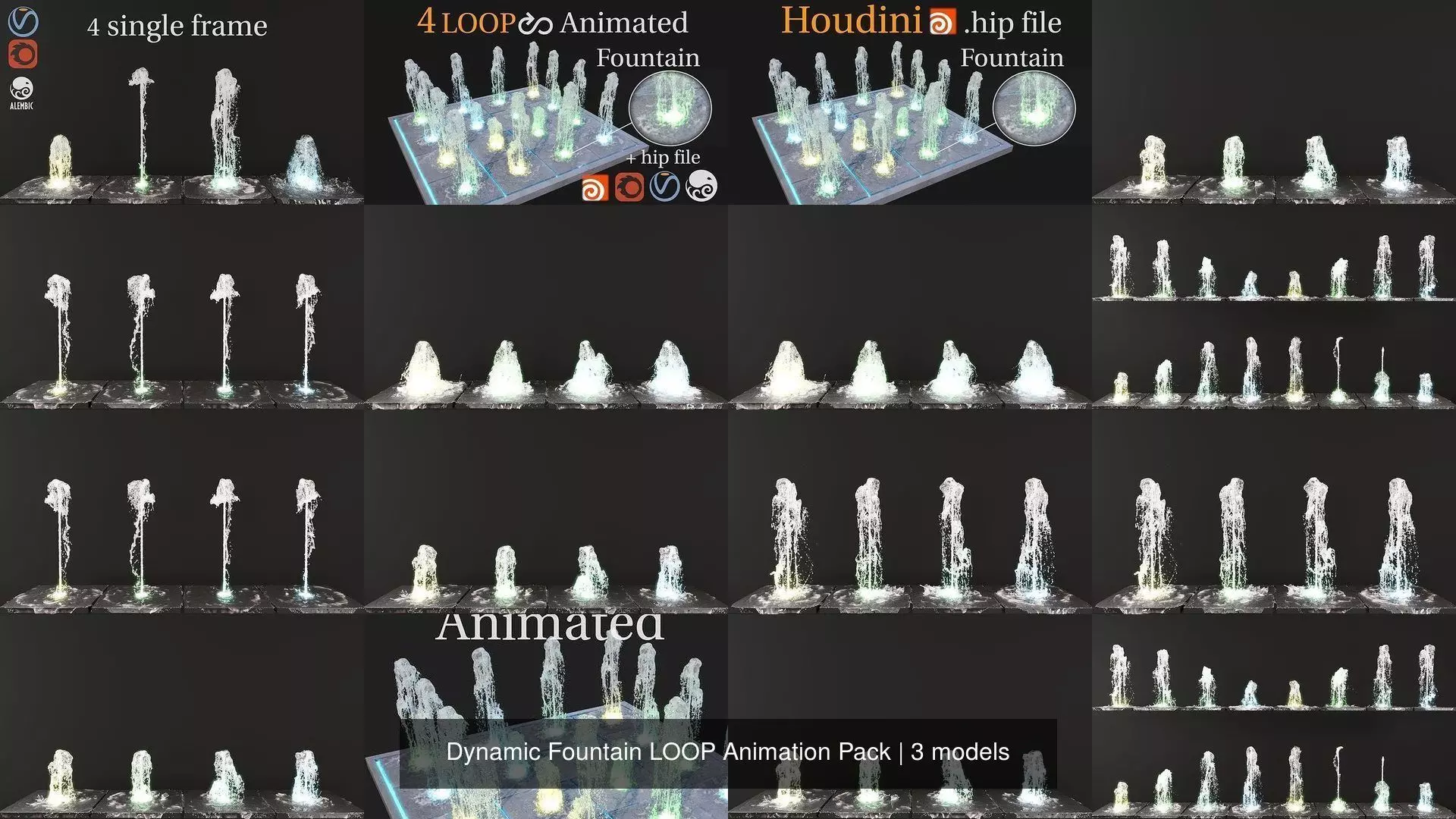 Loop Animation Pack ($28): Enjoy 4 different versions of loopable fountain animations, each featuring 180 frames of fluid motion that seamlessly repeats. The animations are crafted using a unique technique that maintains a continuous flow despite the complex topology changes in each frame.