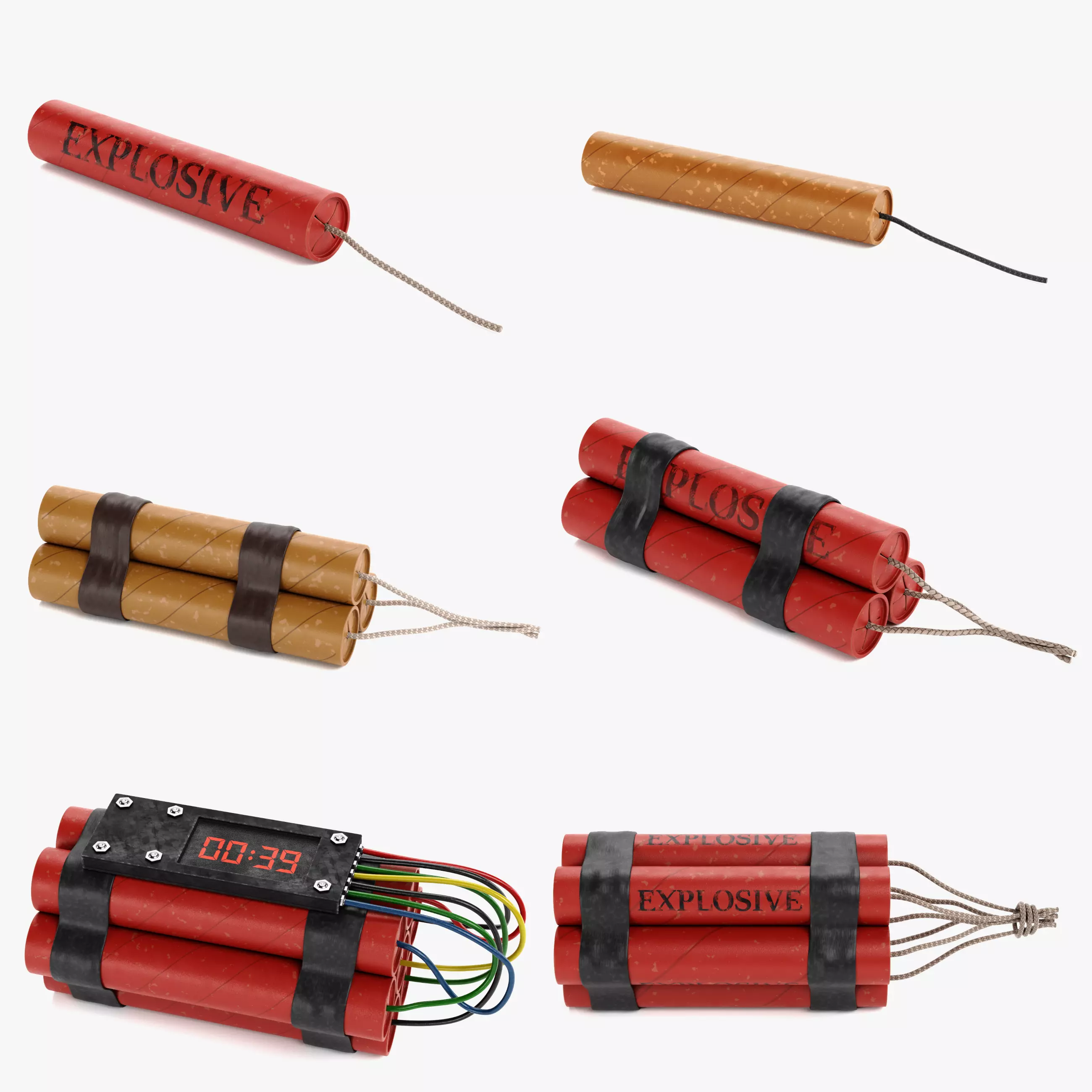 A versatile collection of six dynamite assets covering multiple common explosive configurations, from single sticks to bundled charges and timed setups. The set includes labeled and neutral variants, allowing use across realistic, stylized, or generic scenarios without any specific brand or context lock-in. Clean geometry and clear material definition ensure the props read well both as foreground elements and supporting scene details.