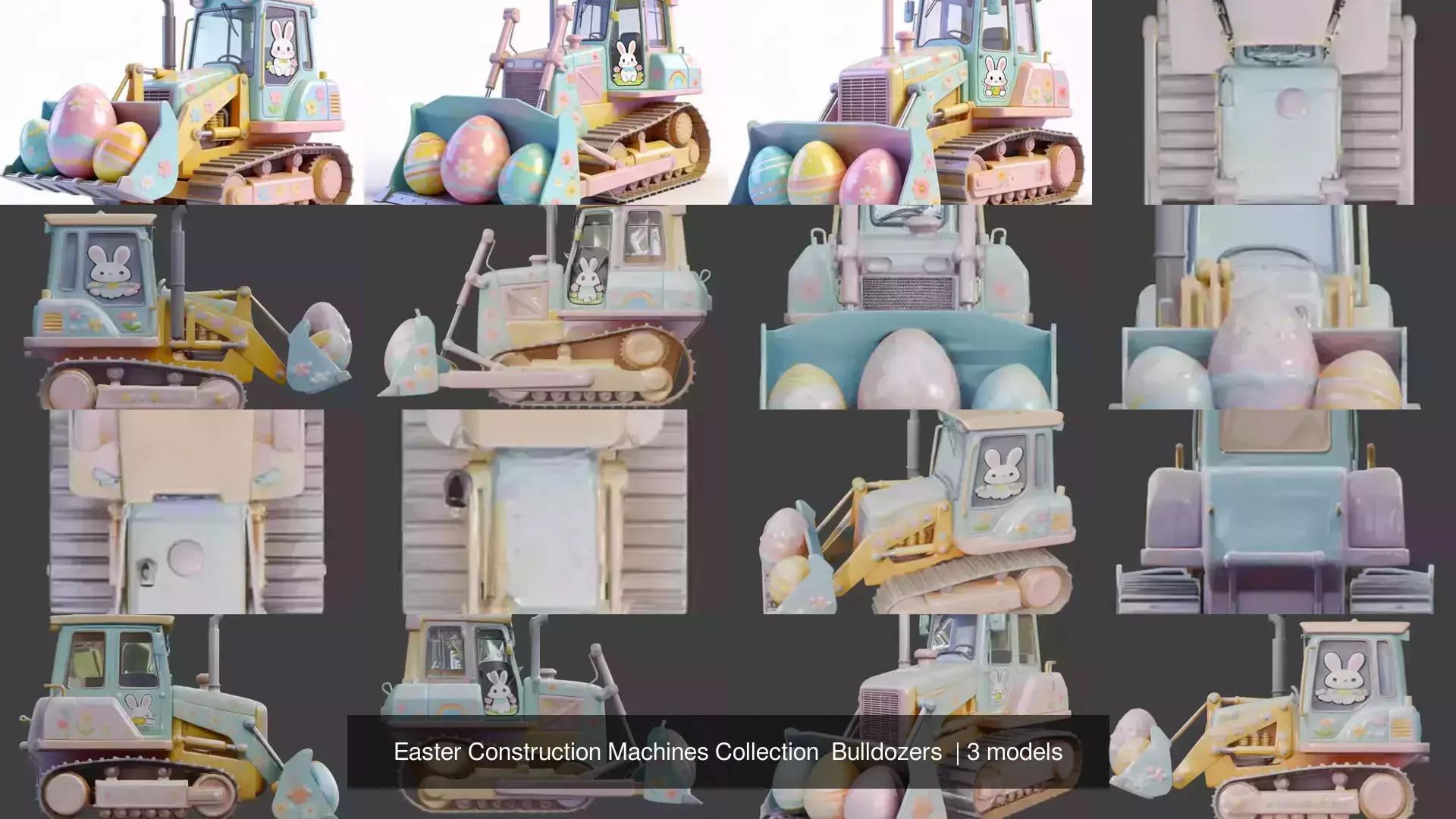 Models included in this collection:• 3D Easter Themed Bulldozer with Giant Colorful Eggs V01• 3D Easter Themed Bulldozer with Giant Colorful Eggs V02• 3D Easter Themed Bulldozer with Giant Colorful Eggs V03