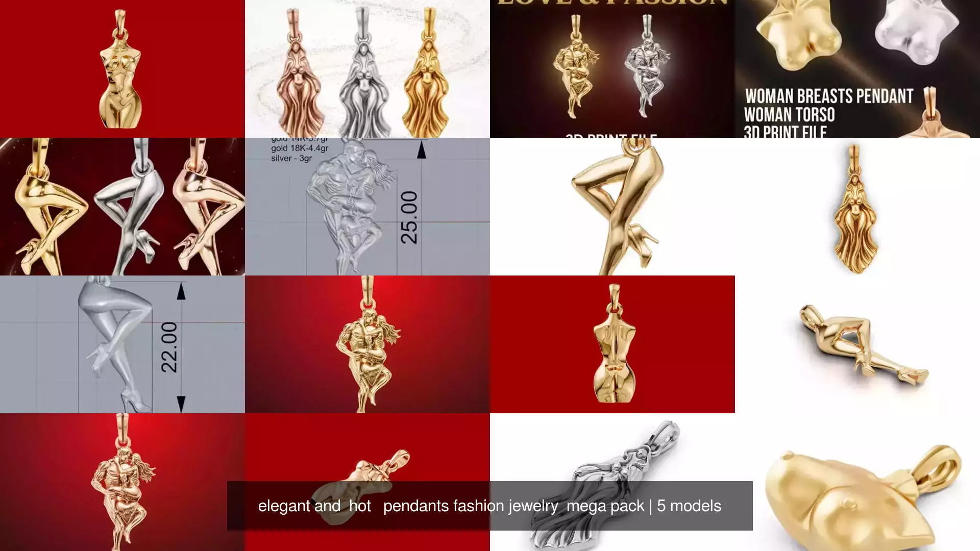 this pack includes 5 different pendants woman body parts, abstract woman body, love and passion pendantsincluded stl and obj file formats