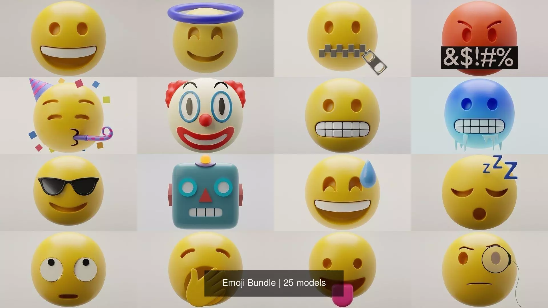 25 unique emoji models all made in Blender 2.81. Images rendered with Cycles rendering engine with 250 samples. All models, scene props, and materials named. All model are UV unwrapped. .blend, .stl, .mtl, .fbx, and .obj files included. NO PLUGINS USED.