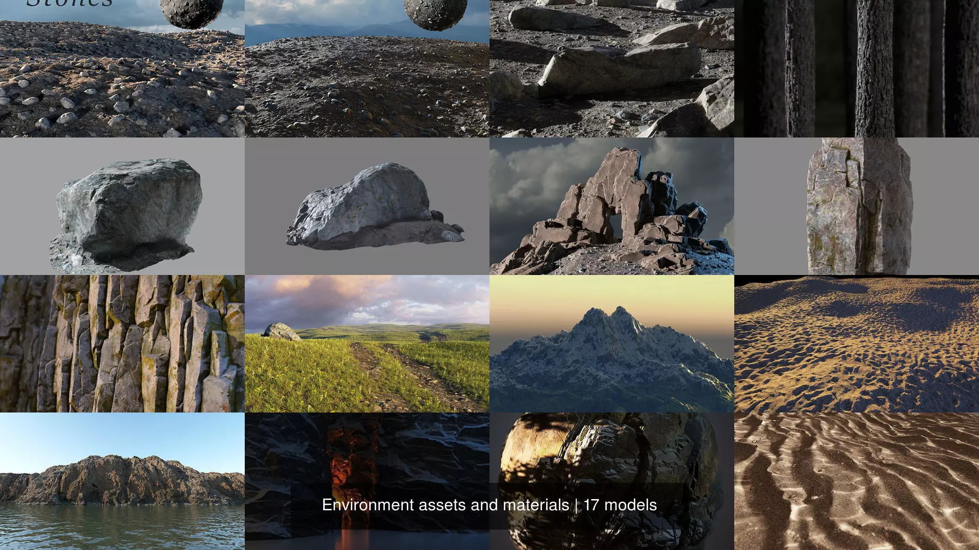 Collection of tileable materials and models for environment scenes. Mostly pbr and low poly, suitable for real time application. Mix of products created with Substance designer/painter, ZBrush sculpting and photogrammetry techniques.