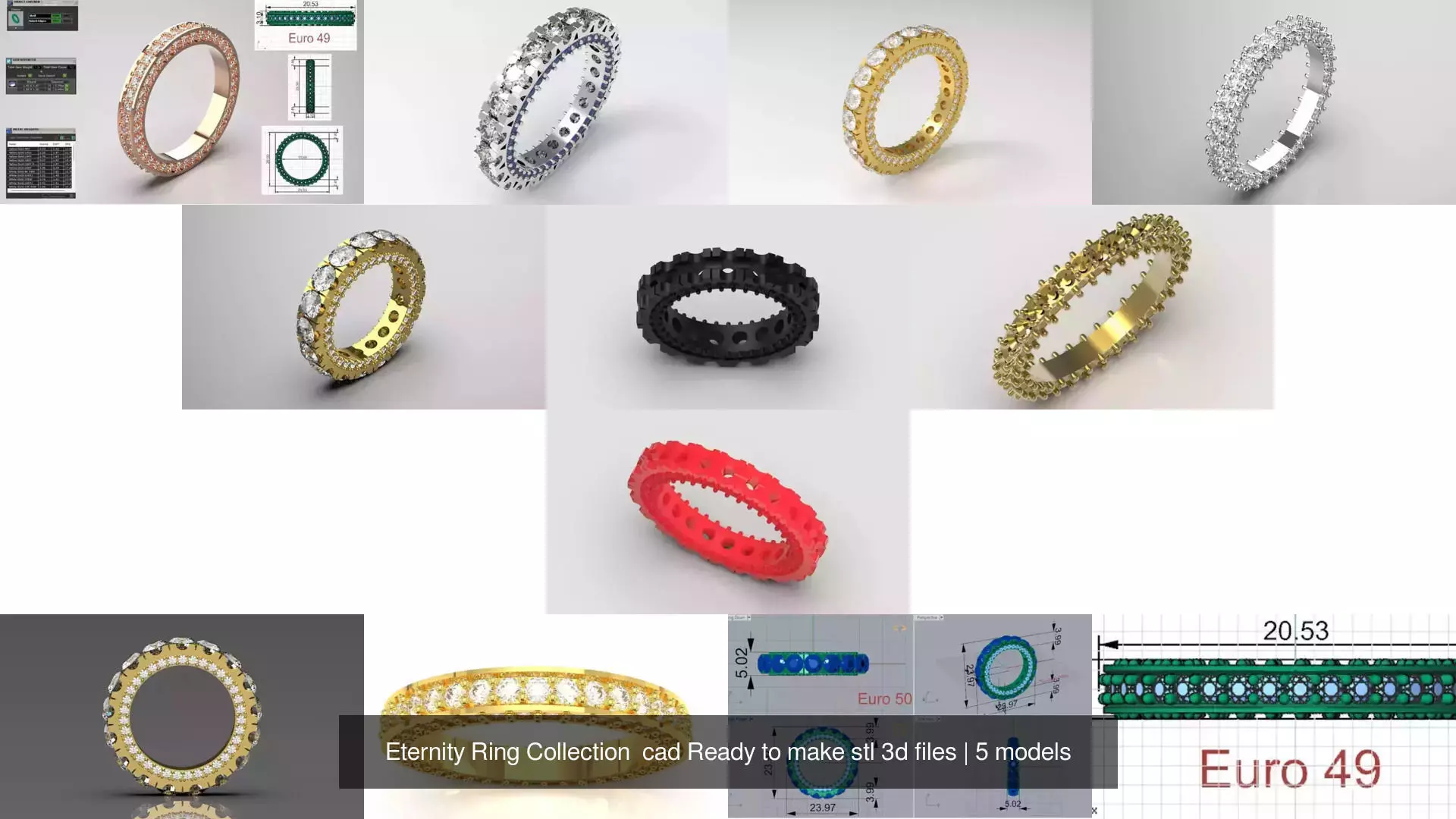 This collection includes five Eternity Ring models that have the same basic design but differ in technical details such as gem dimensions, mounting type and metal material. These files (CAD/STL/3DM) are prepared for online sales and mass production.