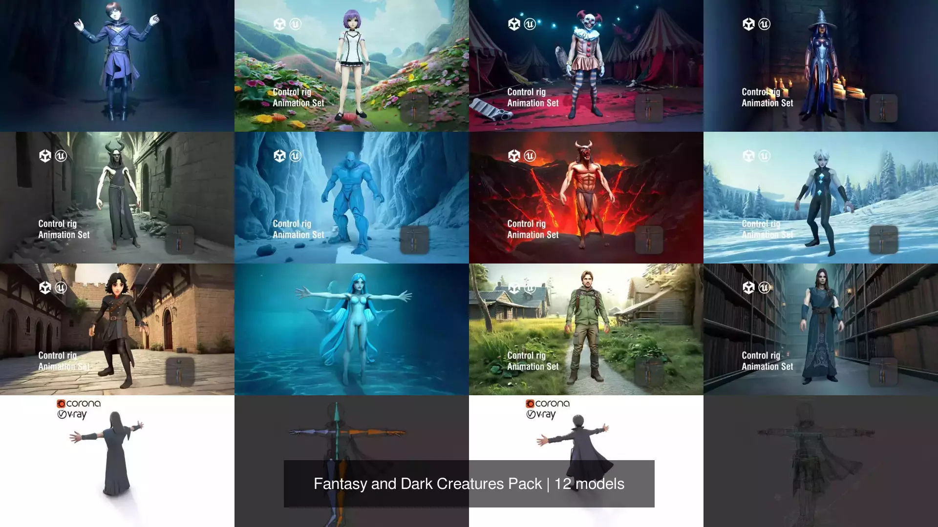 A fantasy set that leans into mystical and dark-fantasy atmosphere, combining humanoid heroes and sorcerers with monstrous and supernatural creatures. Expect archetypes like knight, magician, witch, fairy, and icy sorceress alongside darker silhouettes such as demon-themed characters, hellhound, and an ice golem. This pack works well for fantasy RPGs, dungeon/ruins scenes, cinematic renders, and any project needing a compact but varied roster of magical characters and creatures under one consistent fantasy umbrella.