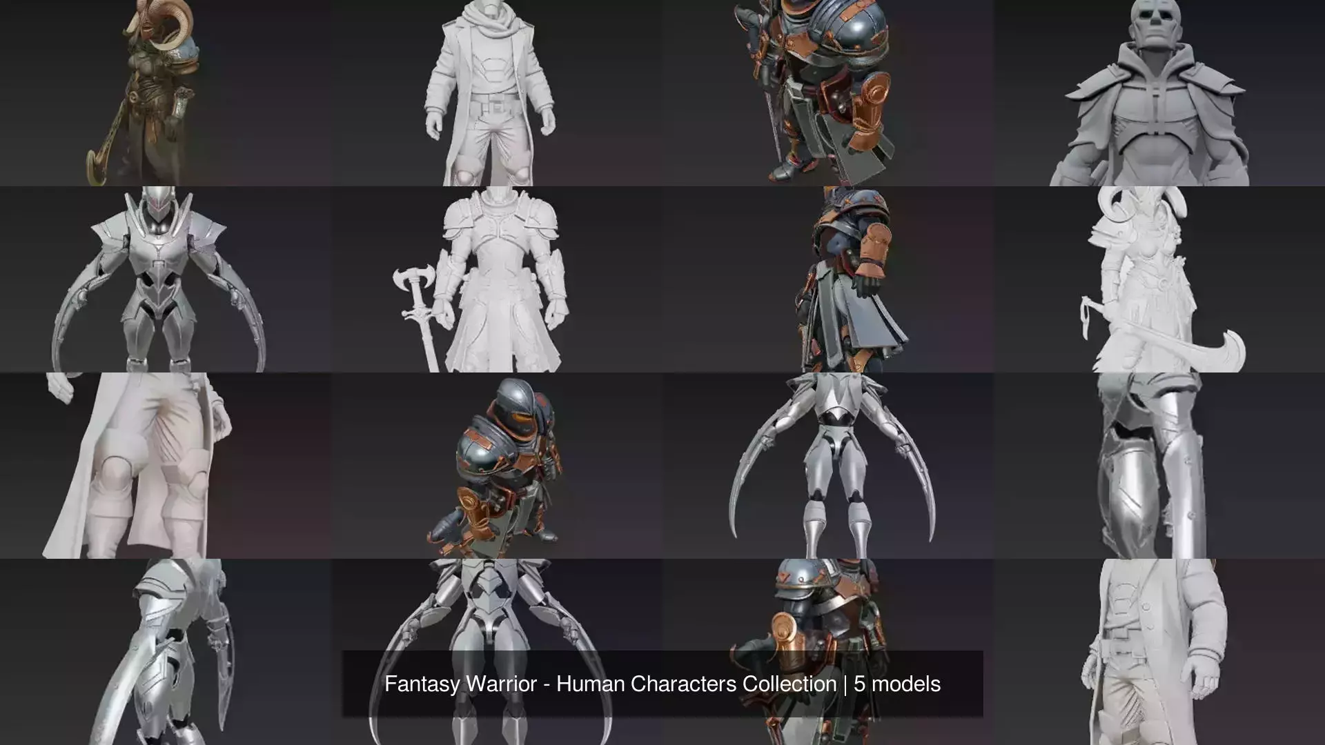 This collection features a range of warrior and humanoid 3D sculptures, blending fantasy armor, stylized anatomy, and dark character design. From fully armored fighters to mysterious cloaked figures, each model is crafted with high detail for both collectible printing and CGI use.