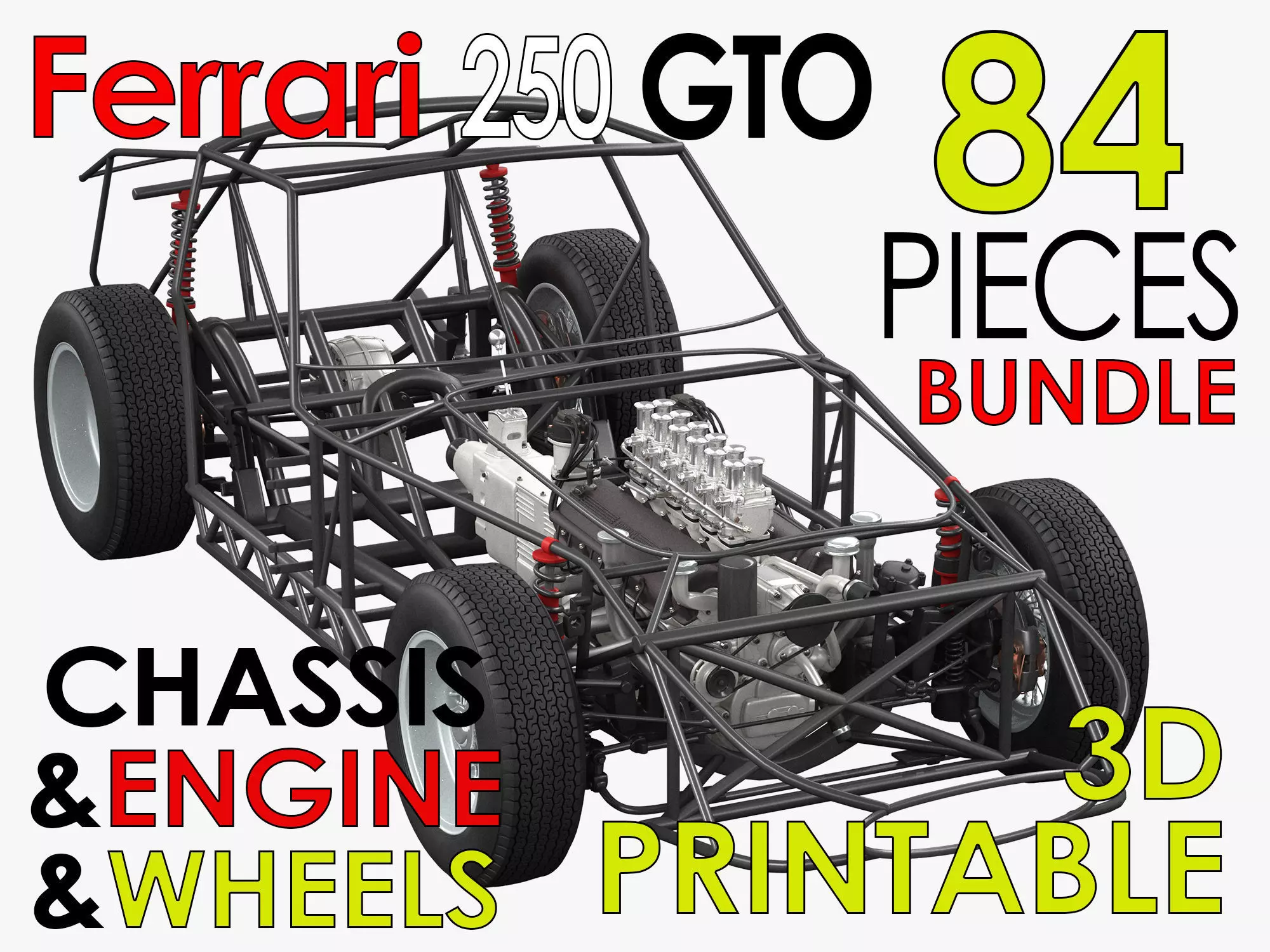 NOTE: This product contains the 3d printable digital files for printing the chassis frame, engine and wheels building kit parts of the Ferrari 250 GTO model.