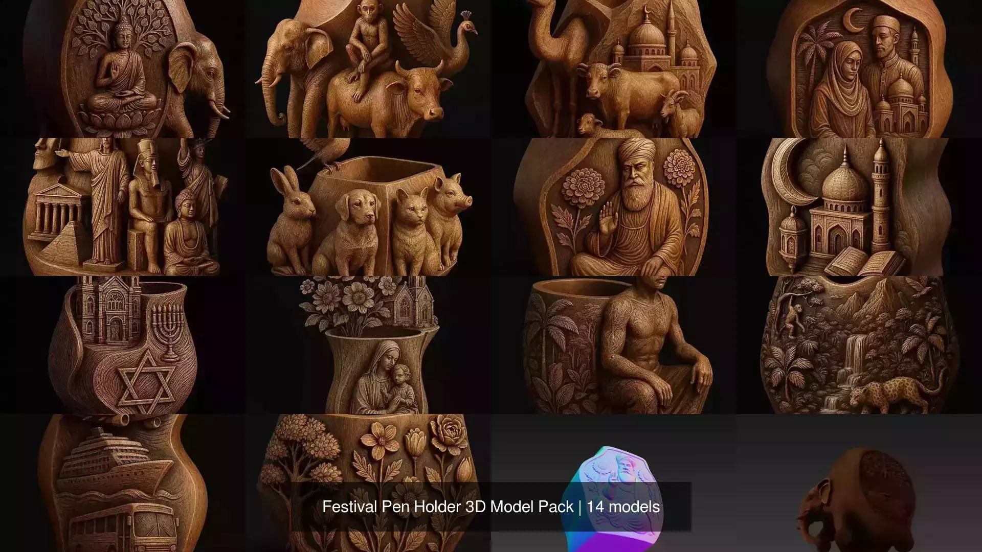 This Different Categories Holder 3D Model Pack features creative Pen Holder designs inspired by Festivals, Celebrations, and Religion themes. The collection includes decorative holders suitable for cultural events, seasonal holidays, spiritual occasions, and special celebrations. Each design is crafted with clean geometry, smooth surfaces, and detailed artistic elements to enhance visual appeal.