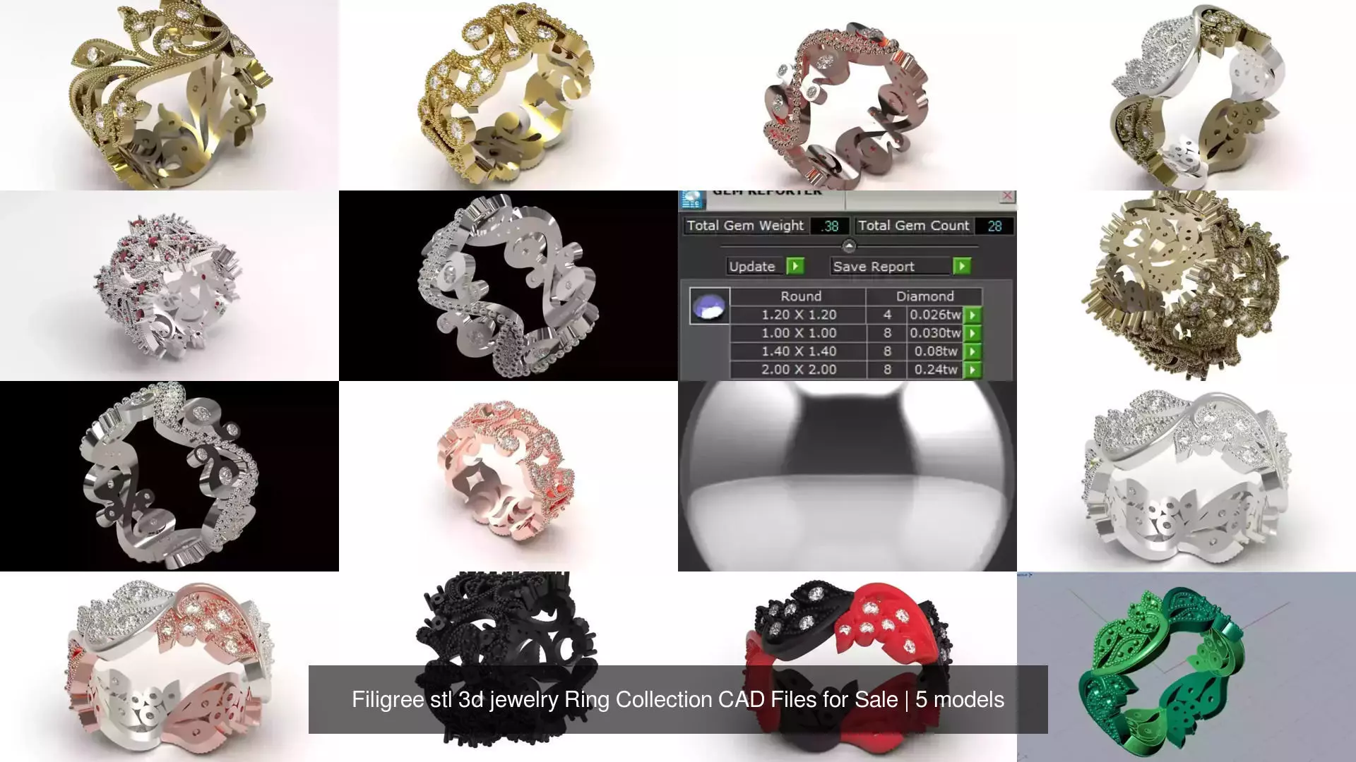 Filigree Ring Collection (CAD Files for Sale)| File Code | Key Style & Features | Stone Density | Complexity | Recommended Metal || :---: | :--- | :--- | :--- | :--- || rr0060 | Classic and balanced scroll. Prominent filigree with regular Miglerine and openwork pattern. | Medium to high. Combination of main stones (2.0-2.5mm) and pavé gemstones. | Medium. Single-piece casting. Balanced metal weight. | Yellow or Rose Gold || rr0059 | Lighter and more open than rr0060. Emphasis on tapestry lines and scroll designs. Fewer main stones and more open space. | Medium. Fewer main stones (dots). Most of the texture is filled with milgrain. | Medium. Integrated design with openwork structure. | Yellow Gold || rr0061 | Modern Rose Gold. Half-filled scroll design, with large beaded textures on one side. Contrast between smooth and grained surface. | Medium to low. Large gems are used in dots. Higher metal weight due to the large volume of metal beads. | Medium. Single cast. Requires precise finishing of the beads. | Rose Gold || rr0063 | Luxury and Two-Tone. Leaf Motif design. Requires separate fabrication of parts to create color contrast. | High. Combination of pavé gems in the white gold section and seed gems in the colored section. | High (separate assembly). Requires two casting processes (for two metal colors) and final assembly. | White and yellow gold || rr0004 | Full 3D gem. The widest and most elaborate design. Extremely high density of gems in complex plant textures. | Extremely high. Complete surface coverage with microscopic pavé. (over 100 to 200 tiny gems). | Very high. Bulky, heavy, and requires very high precision in cutting. | White gold or platinum |