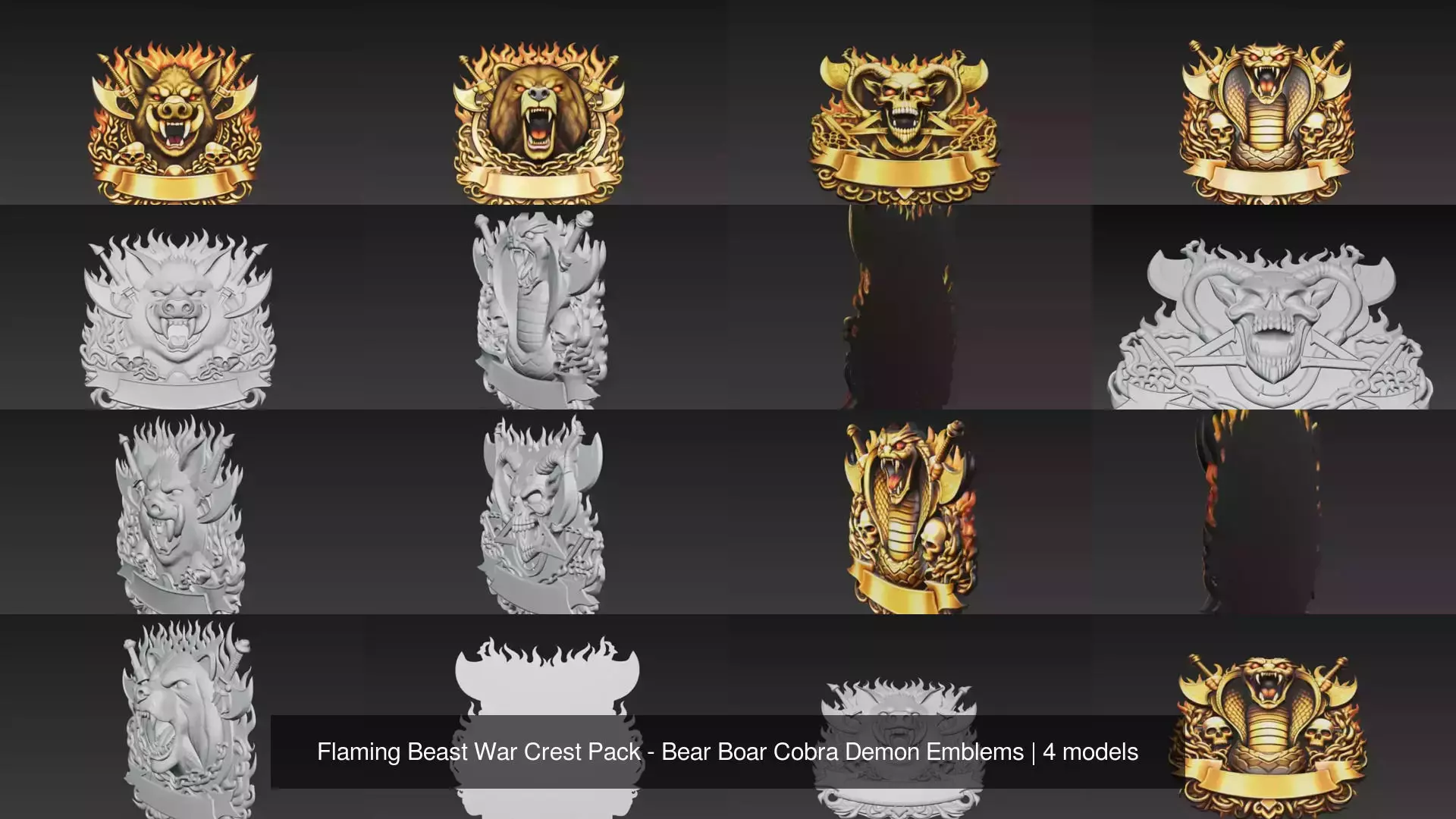 The Flaming Beast War Crest Pack is a dark fantasy heraldic collection inspired by powerful war beasts and infernal battle symbolism. Each crest features aggressive animal figures, flaming weapon motifs, and ornate golden heraldic compositions sculpted in a dramatic fantasy style.