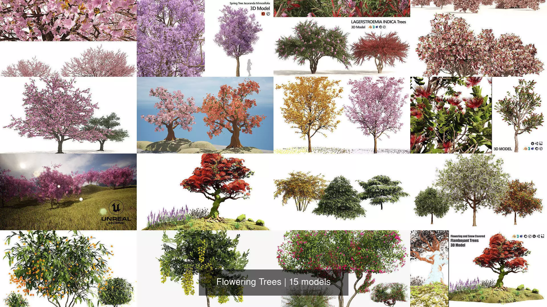 This vibrant collection of flowering tree 3D models is perfect for adding life and color to your architectural visualizations, game environments, and other 3D projects. The pack includes a variety of tree types, each meticulously crafted with realistic textures and detailed foliage.Key Features:• Variety of Species: This pack features several distinct flowering tree species, offering a diverse range of shapes, sizes, and colors. Included are models resembling: o Cherry Blossom Trees (Pink and Light Pink): Featuring delicate pink blossoms, these trees evoke a sense of spring and beauty.o Crabapple Trees (Red and Orange): With their vibrant red and orange flowers, these trees add a splash of warm color to any scene.o Lilac Trees (Purple): These trees showcase beautiful clusters of fragrant purple flowers.o White Flowering Trees (Possibly Dogwood or similar): Featuring clean, white blossoms, these trees offer a classic and elegant look.• High-Quality Textures: Each tree is textured with high-resolution images of bark, leaves, and flowers, ensuring realistic visuals.• Optimized for Performance: The models are designed to be efficient for rendering without sacrificing visual quality, making them suitable for both real-time and offline rendering.• Multiple Formats: The pack is available in various common 3D formats (mention specific formats like .fbx, .obj, .blend, etc.), ensuring compatibility with a wide range of 3D software.• Ready to Use: Simply import the models into your scene and start rendering.